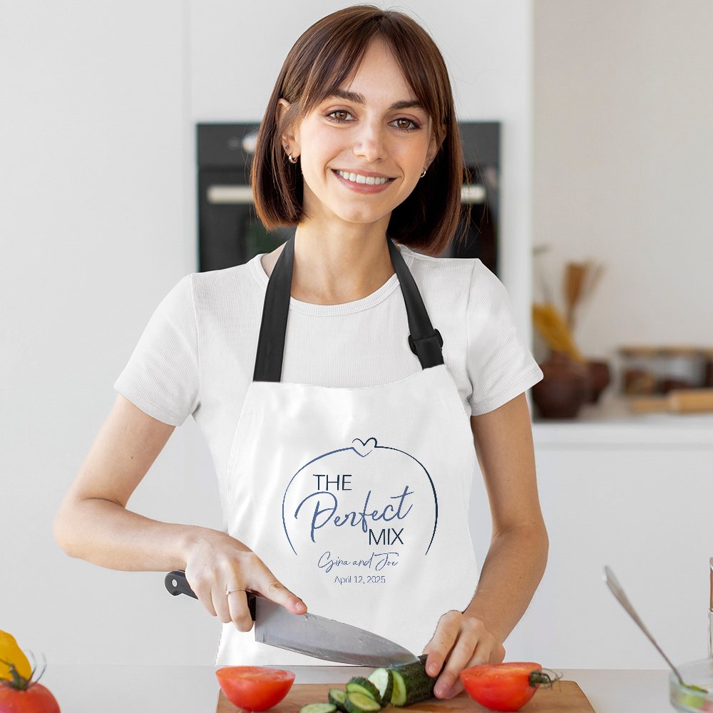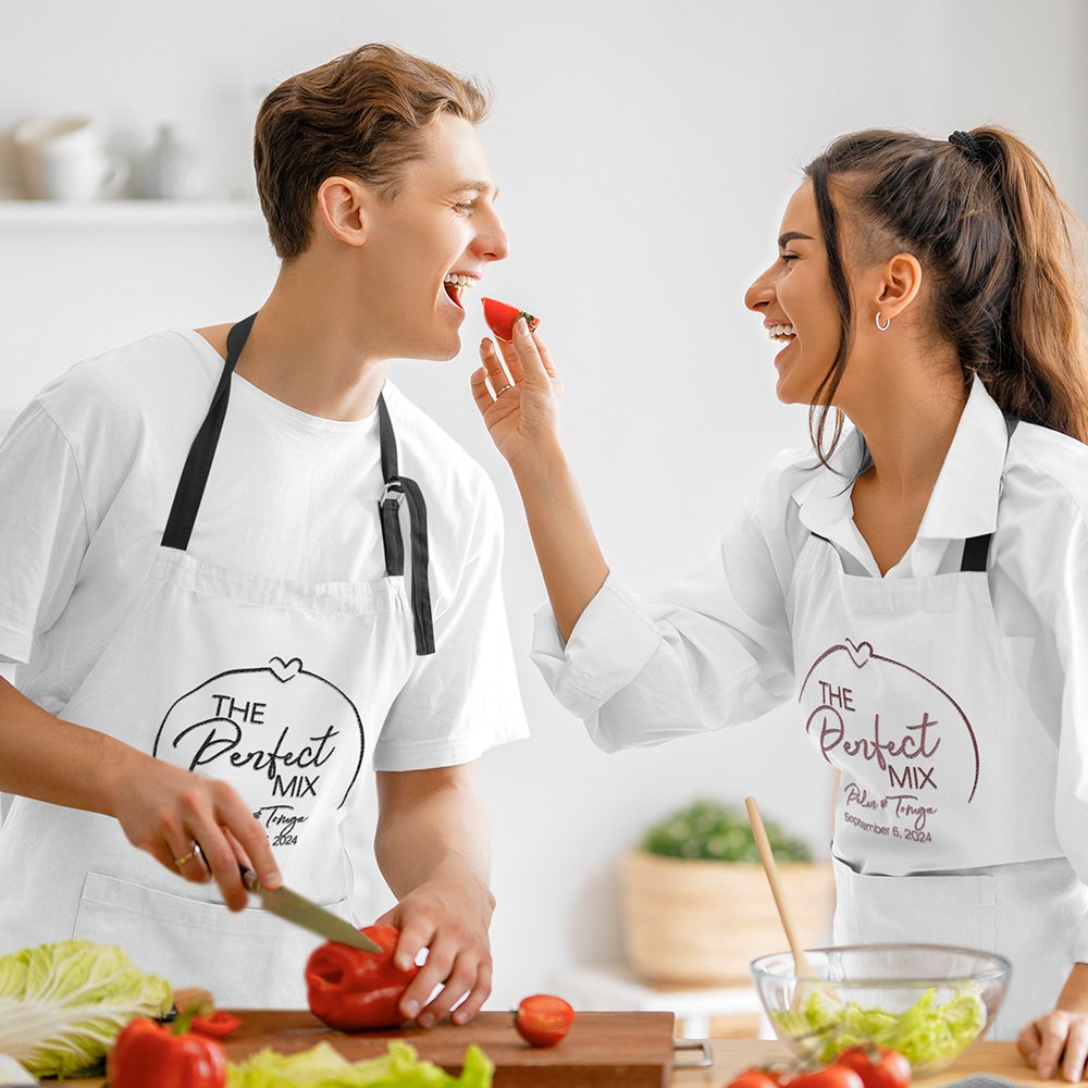 Diese Schürze steht unter dem Motto "The Perfect Mix" und ist für Paare gedacht, die gemeinsam kochen oder Gäste bewirten. Sie kann mit den Namen des Paares, Spitznamen oder Daten von besonderer Bedeutung personalisiert werden, die auf die Schürze gedruckt werden können. Das Design ist einfach und modisch, mit einer Vielzahl von Mustern und Farben zur Auswahl.