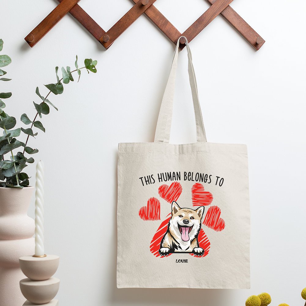 Die Vorderseite der Tragetasche zeigt den verspielten Satz "This Human Belongs To" zusammen mit einem niedlichen Haustierporträt und Herzen mit Pfotenabdruck. Das schlichte und charmante Design ist perfekt, um Ihre Liebe zu Ihrem pelzigen Begleiter zu zeigen, wo auch immer Sie hingehen. Außerdem sind die langlebigen und wiederverwendbaren Materialien eine umweltfreundliche Alternative zu Einweg-Plastiktüten.