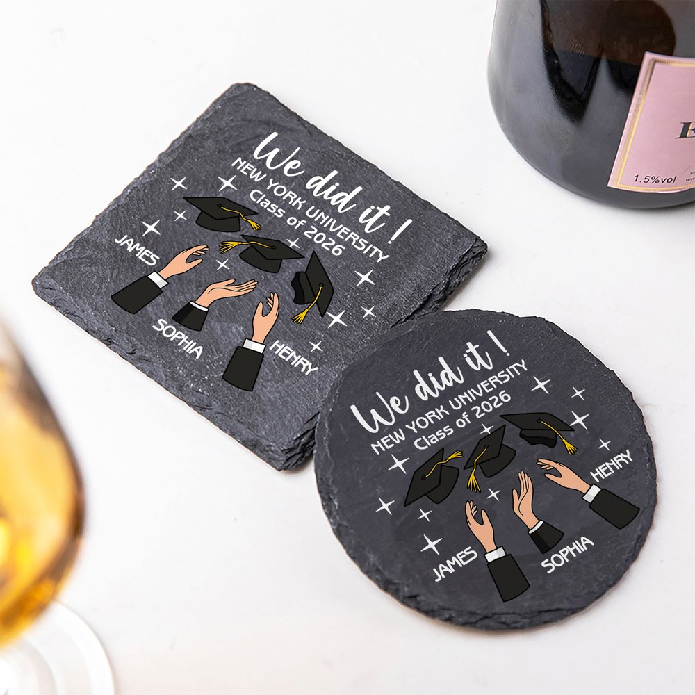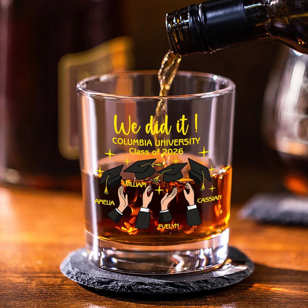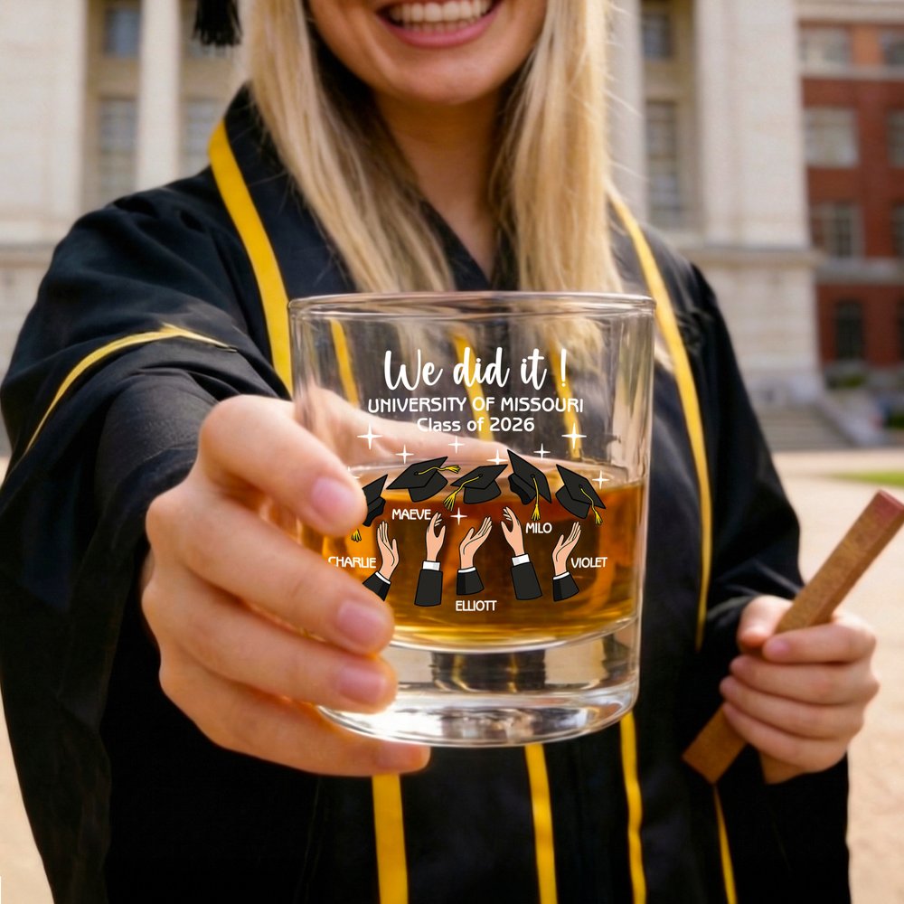 Dieses Whiskeyglas zeigt eine feierliche Illustration, die den freudigen Moment der Absolventen einfängt, die ihre Abschlusskappe aufsetzen. Das Design zeigt die feierliche Phrase "We Did It!" zusammen mit dem Namen des Absolventen, dem Abschlussjahr und dem Namen der Universität. Das Gesamtdesign macht aus einem funktionalen Glas ein visuelles Fest, das die Aufregung und den Stolz der Absolventen zum Ausdruck bringt.