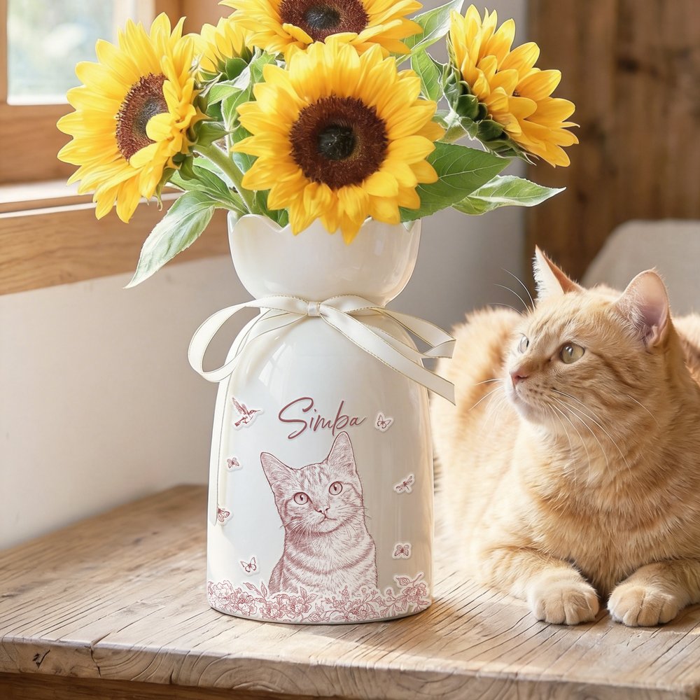 Sie können ein Foto Ihres geliebten Hundes oder Ihrer Katze hochladen, das dann auf der Vorderseite der Vase in ein zartes Line-Art-Porträt verwandelt wird, gepaart mit dem Namen Ihres Haustiers in einer fließenden, eleganten Schrift. Das Design wird durch bezaubernde Schmetterlingsakzente und eine zarte Blumenbordüre am Boden ergänzt und macht die Vase zu einem einmaligen Erinnerungsstück.