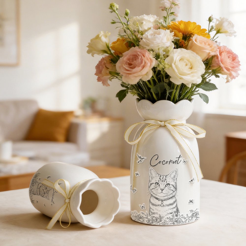 Die Vase ist aus hochwertiger Premium-Keramik gefertigt und verfügt über eine glatte, glänzende Oberfläche, die sich luxuriös anfühlt und für eine lange Lebensdauer ausgelegt ist. Das Verfahren stellt sicher, dass das individuelle Haustierporträt und der Name auch nach jahrelangem Gebrauch klar und lebendig bleiben und nicht verblassen, während die robuste Keramikkonstruktion Kratzern und Beschädigungen standhält.