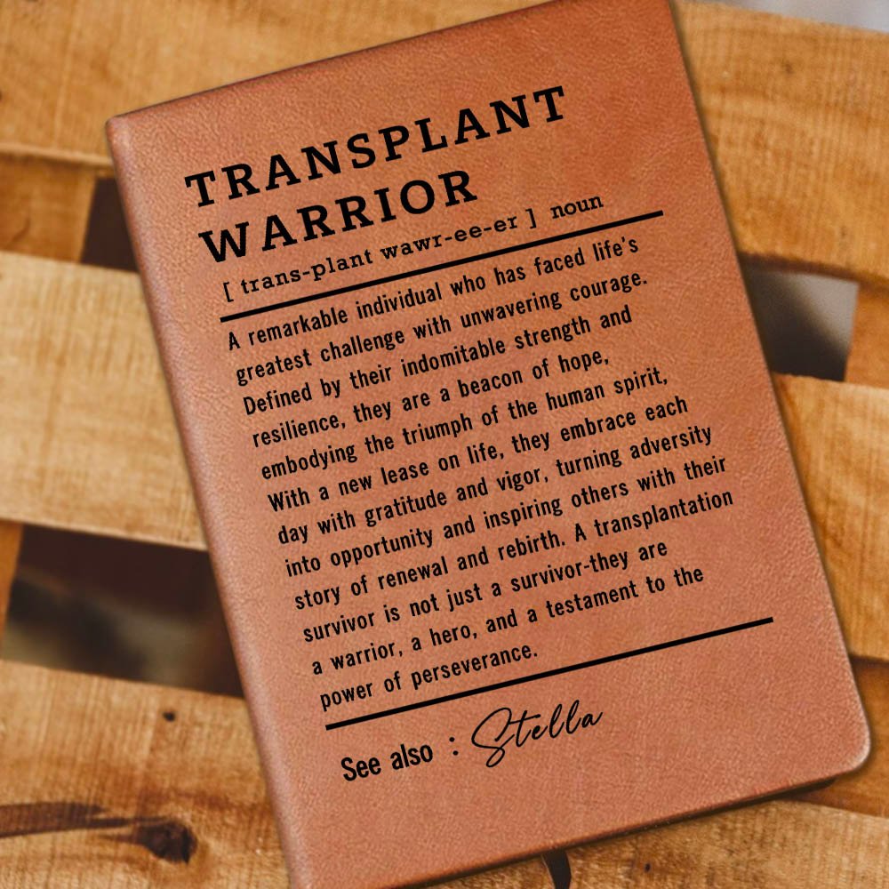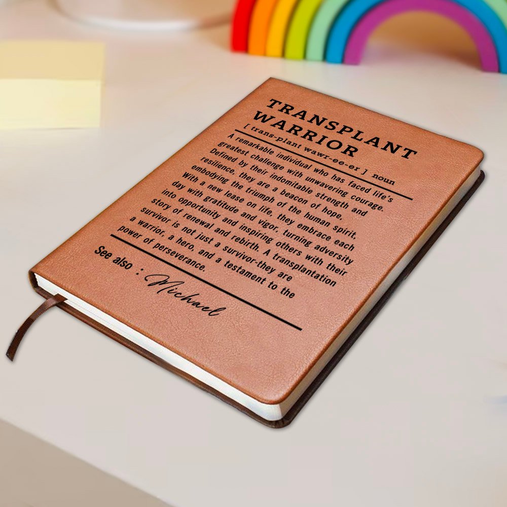 Der braune Einband dieses Notizbuchs verleiht ihm eine ruhige und klassische Ausstrahlung. Der Titel "Transplant Warrior" auf dem Einband und die darauf folgende Erklärung der Definition sind eine Hommage an den Mut und die Ausdauer von Transplantationsüberlebenden. Sie können auch den Namen eines Überlebenden einer Organtransplantation auf dem Ledereinband verewigen, um die unglaubliche Reise der Genesung und Stärke zu feiern.
