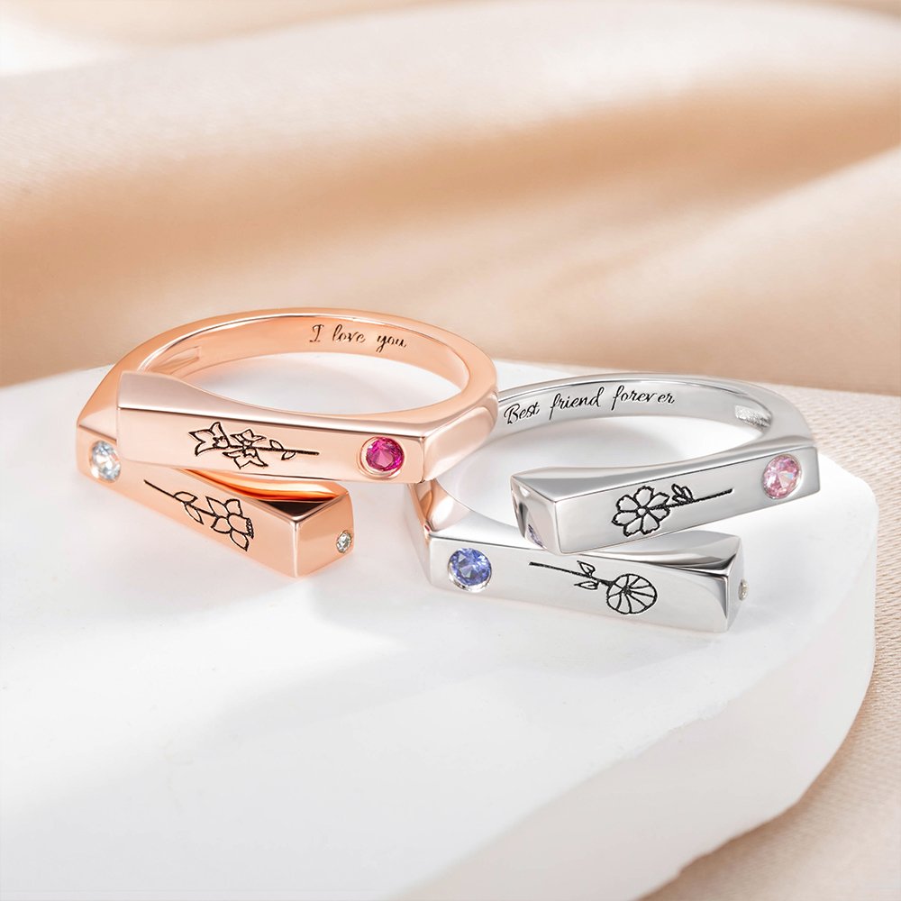 Mit der Möglichkeit, zwei Geburtsblumen und Geburtssteine zu gestalten, wird dieser Ring zu einem wirklich persönlichen und einzigartigen Schmuckstück. Es ermöglicht Ihnen, Ihre Liebe, Wertschätzung und herzliche Gefühle auf eine besondere und sinnvolle Weise auszudrücken. Sie können auch Namen oder herzliche Botschaften auf dem Innenring eingravieren lassen, um diesem einzigartigen Schmuckstück eine persönliche Note zu verleihen.