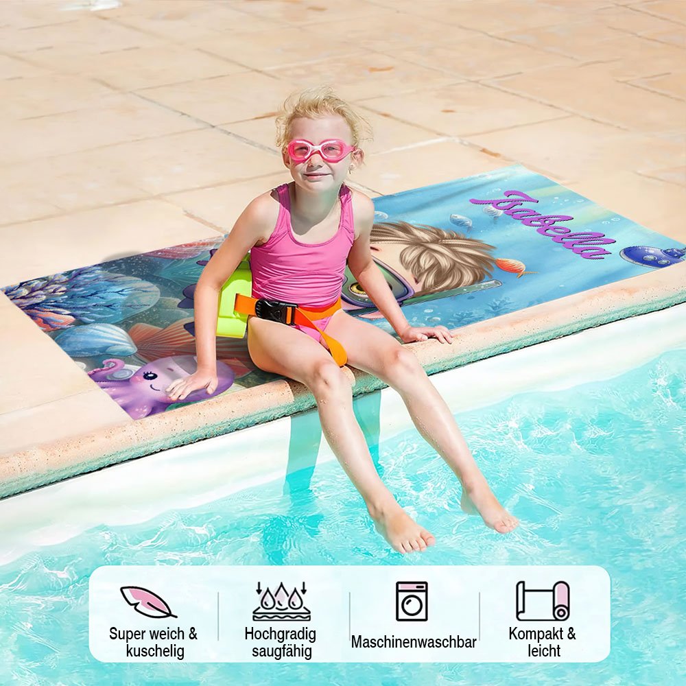 Jedes Strandtuch kann mit Zeichentrickfiguren von Kindern in Taucheranzügen sowie mit Meeresbewohnern wie U-Booten, Fischen, Delfinen, Schildkröten und Algen individuell gestaltet und mit exklusiven Namen versehen werden. So entsteht eine interessante Unterwasser-Abenteueratmosphäre, die den Kindern ein einzigartiges Gefühl von Exklusivität und kindlichem Spaß vermittelt.