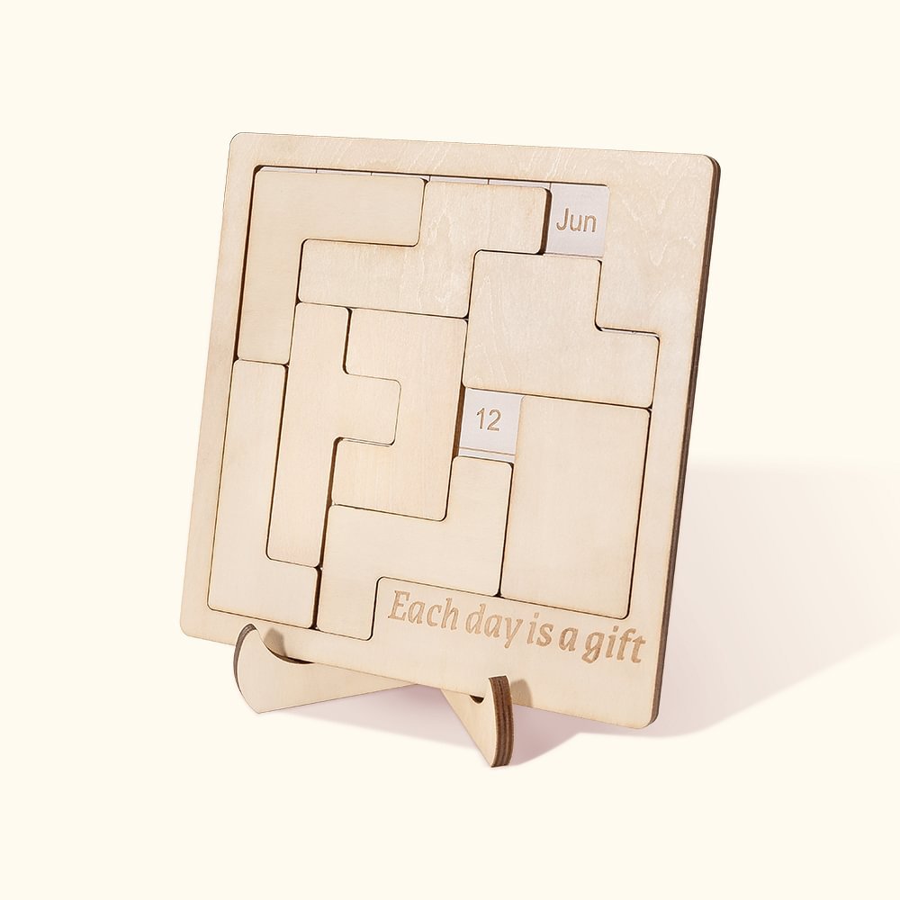 Die Rückseite des Puzzles besteht aus Holz, das mit weißer Farbe bemalt ist und die einzelnen Monate und Tage