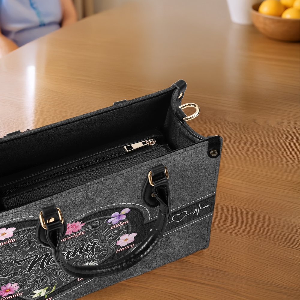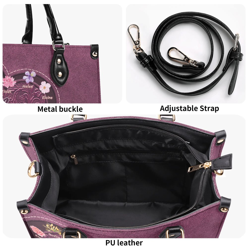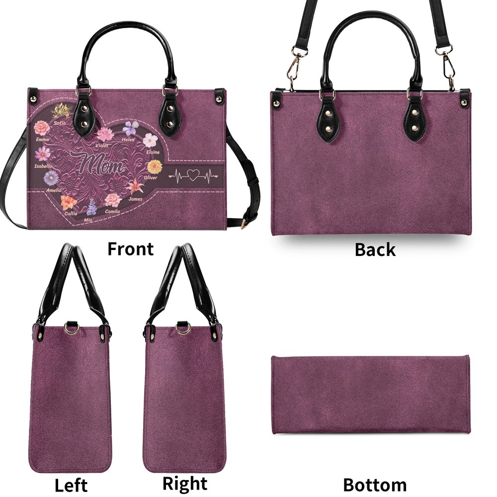 Die acht Hauptfarben, darunter Lila, Grau und Grün, mit schwarzen oder beigen Griffen und Riemen sorgen für ein luxuriöses und stilvolles Aussehen. Ein anpassbarer Titel wird in das herzförmige Muster gedruckt, umgeben von 1-12 Geburtsblumen und Namen für verschiedene Monate, die die Einzigartigkeit und Bedeutung jedes Familienmitglieds oder Freundes symbolisieren.