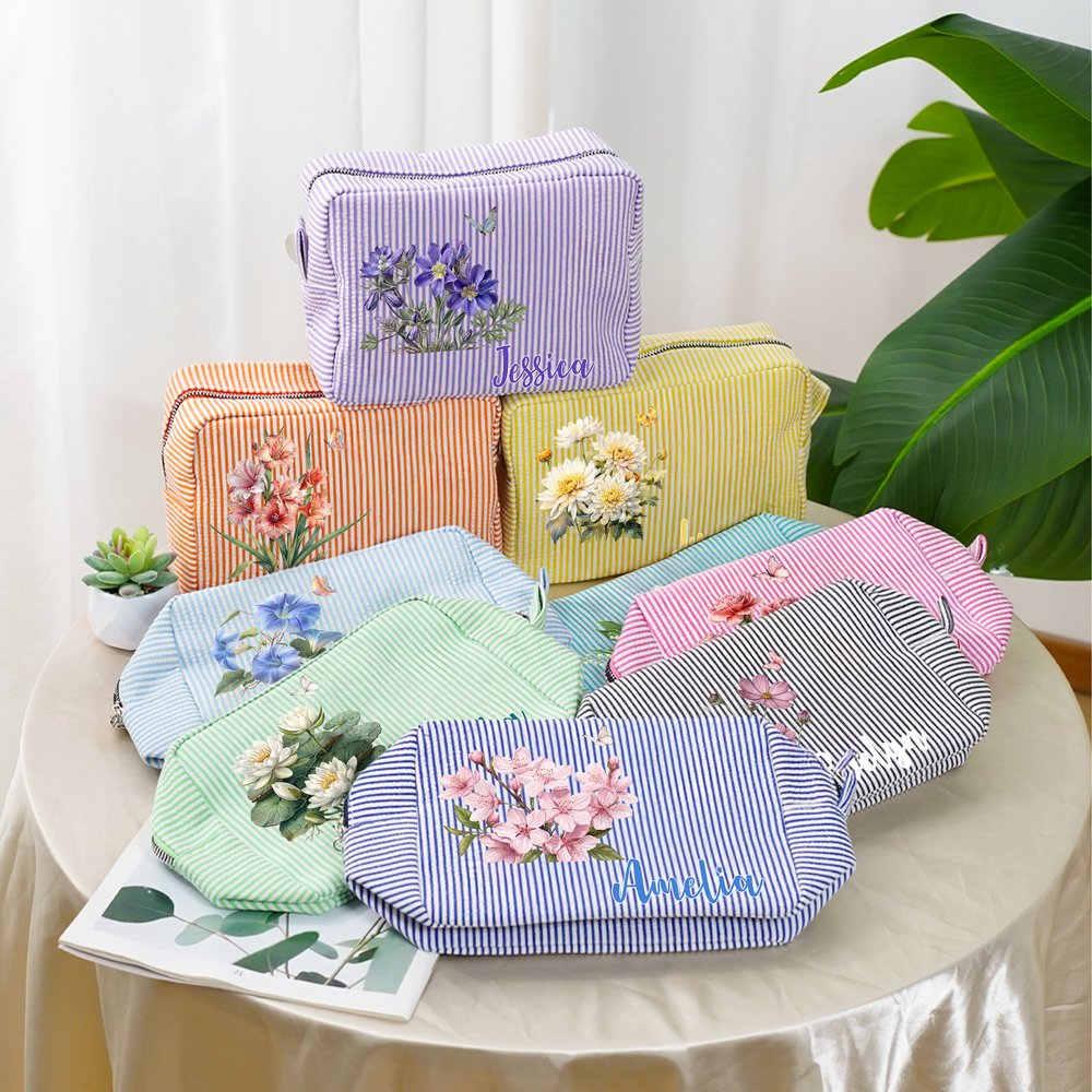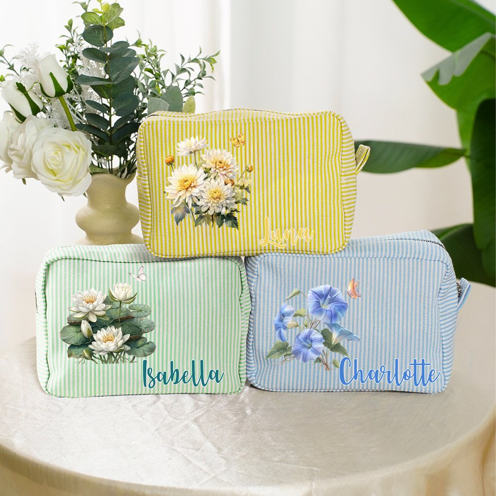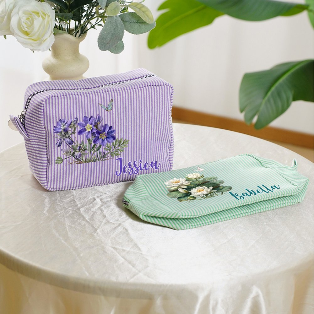 Diese Kosmetiktasche im frischen Vintage-Look kombiniert klassisch gestreiften Stoff mit zarten Geburtsblumen und personalisierten Namensdetails und ist ein einzigartiges Accessoire, das Ihren persönlichen Stil widerspiegelt.
