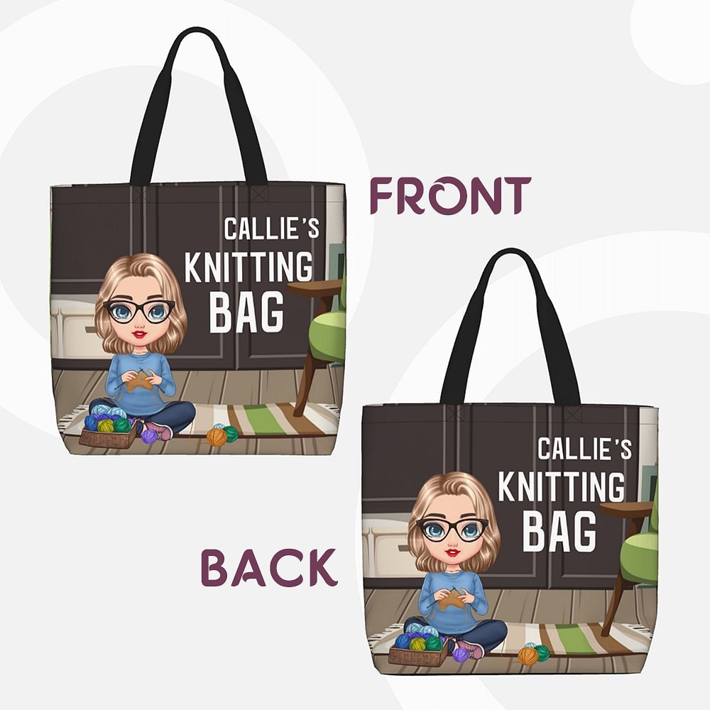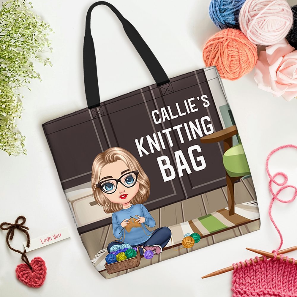 Diese stilvolle Retro-Tasche zeigt das Cartoon-Motiv einer gemütlichen und bequemen Frau, die auf einem Teppich sitzt und strickt. Sie können sie mit Ihrem Namen versehen und so Ihre Leidenschaft für das Stricken und Ihre hervorragenden Häkelkünste unter Beweis stellen.