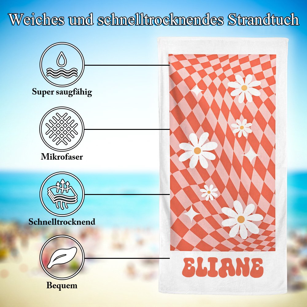 Dieses Strandtuch hat einen klassisch karierten Hintergrund mit lebhaften Gänseblümchen-Elementen, die den lebendigen Geist der 1970er Jahre widerspiegeln. Wir bieten Ihnen sechs Farboptionen zur Auswahl, die es Ihnen ermöglichen, es mit Ihrem Namen individuell zu gestalten und Ihren einzigartigen Stil zu präsentieren.