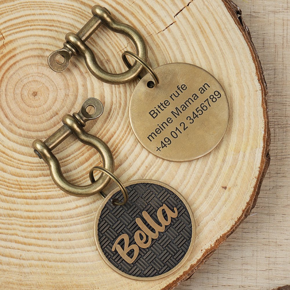 Diese Hundemarke im Vintage-Stil überzeugt durch ihre runde Form und eine edle Messingoptik mit natürlichem Metallglanz, die ihr einen zeitlosen und eleganten Charakter verleiht. Auf der Vorderseite lässt sich der Name Ihres Haustiers gravieren, während die Rückseite Platz für die Kontaktdaten des Besitzers bietet – so vereinen sich ansprechendes Design und praktische Funktion auf harmonische Weise. Als stilvolles Accessoire am Halsband Ihres Haustiers setzt die Marke einen dezenten Akzent und unterstreicht zugleich Ihren Sinn für Ästhetik und Qualität.