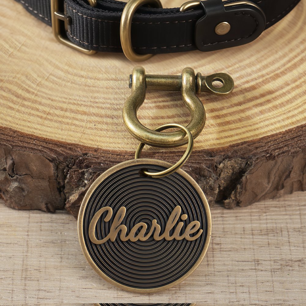 Dieses Namensschild für Haustiere ist im Vintage-Stil gehalten, mit einer runden Form und dem natürlichen Metallglanz von Messing, der einen eleganten Vintage-Charme ausstrahlt. Auf der Vorderseite kann der Name des Tieres und auf der Rückseite ein Text mit den Kontaktdaten des Besitzers angebracht werden, so dass Ästhetik und Zweckmäßigkeit in Einklang gebracht werden. Es dient als raffiniertes Accessoire für das Halsband des Haustiers und zeigt gleichzeitig den modischen Geschmack des Besitzers.