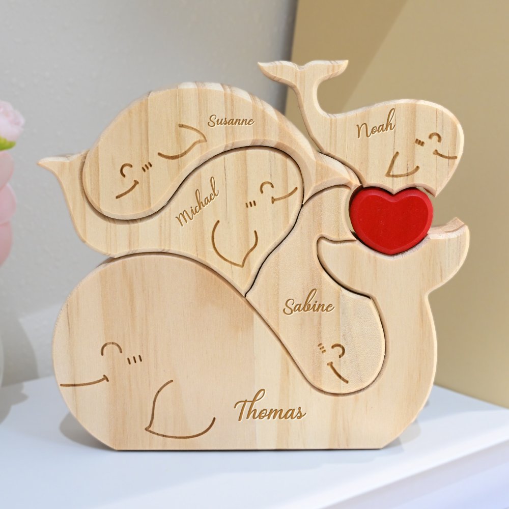 Dieses Puzzle zeigt eine aufwendig gestaltete Walform, die eine Familie darstellt, die sich umarmt, mit einem roten Herzen in der Mitte, das Einigkeit und Zusammengehörigkeit symbolisiert. Das Design verbindet Kunst und Bedeutung auf wunderbare Weise und erlaubt es Ihnen, es mit 2 bis 5 Namen zu versehen. Es ist nicht nur ein dekoratives Stück. Es dient als bleibende Erinnerung an die Liebe und Unterstützung Ihrer Familie.