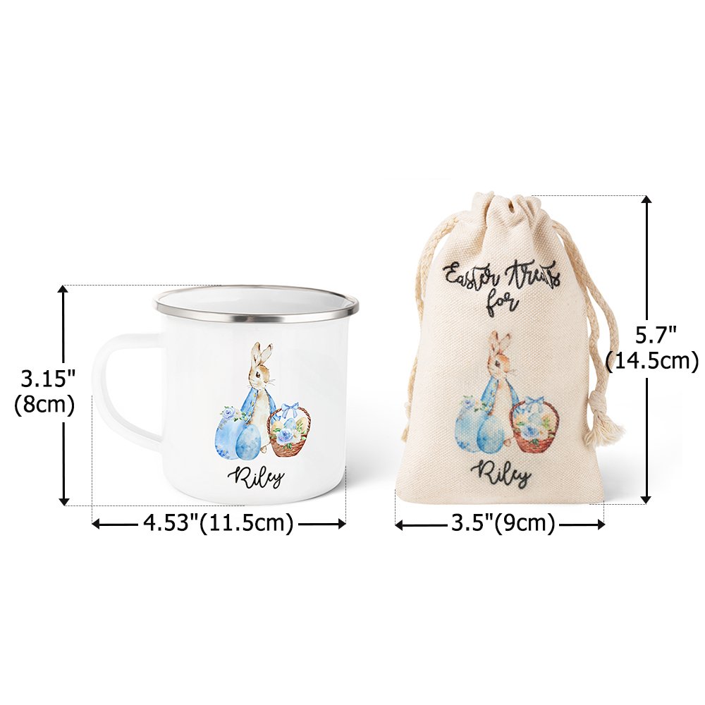 Diese Emaille-Tasse und -Leckerli-Tasche zeigt ein rosa und blaues Peter-Hasen-Motiv mit 4 niedlichen Hasenmotiven zur Auswahl, gepaart mit fröhlichen Elementen wie Blumenkörben, bunten Eiern, Küken und Girlanden. Das lebhafte Bild zieht sofort die Aufmerksamkeit der Kinder auf sich. Die Vorderseite kann mit dem Namen des Kindes personalisiert werden, damit es sich besonders umsorgt und beachtet fühlt.