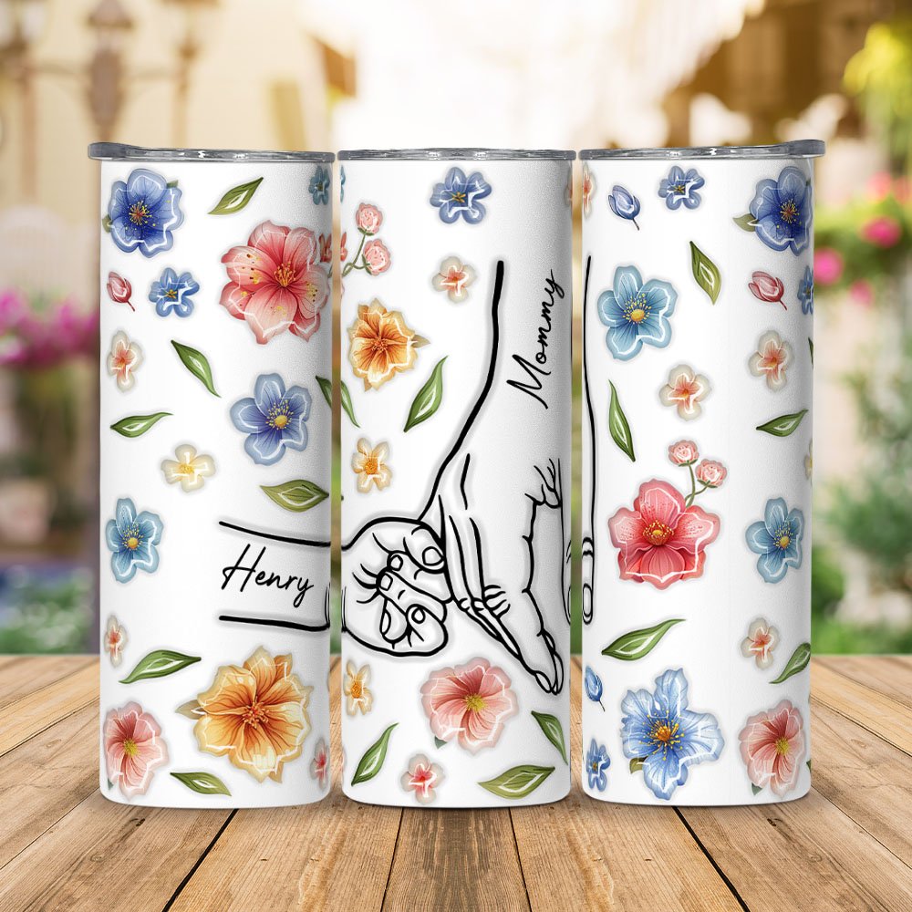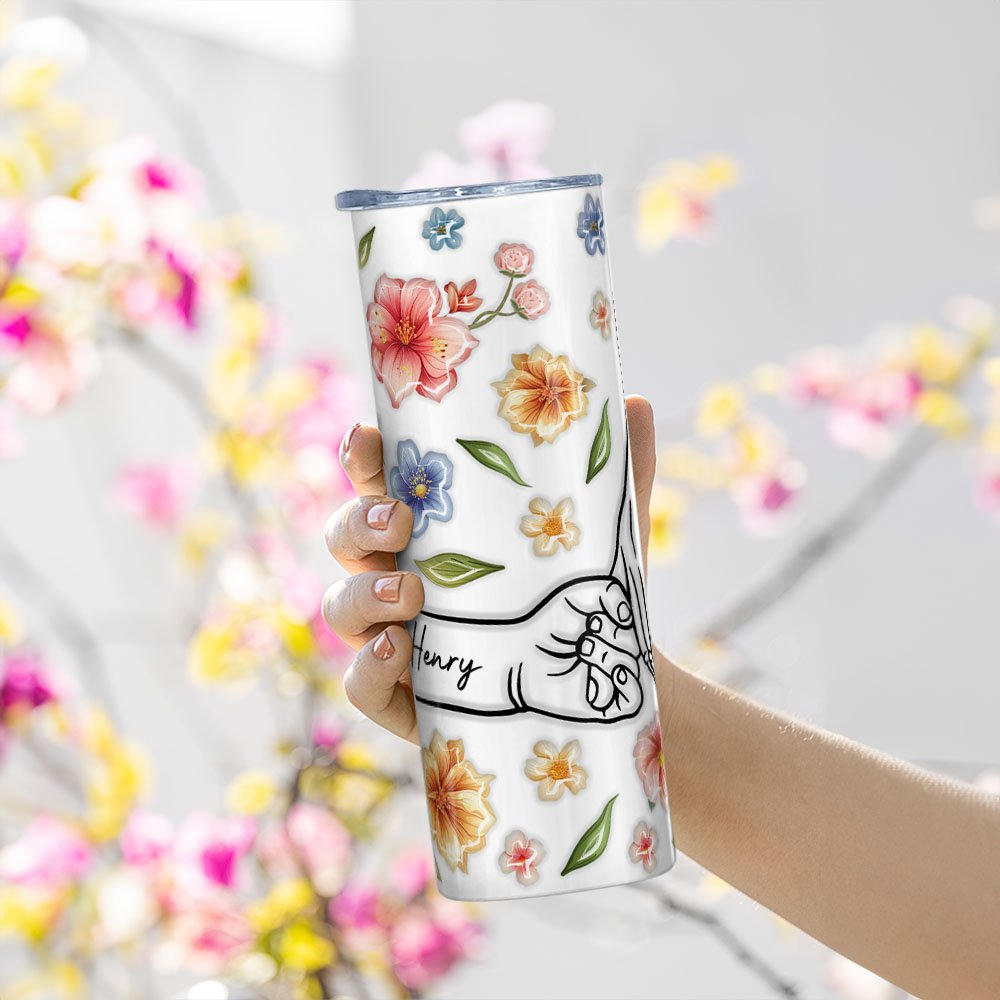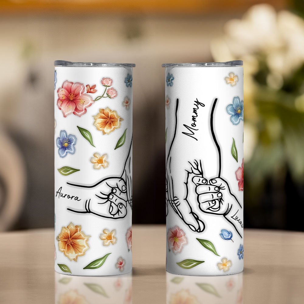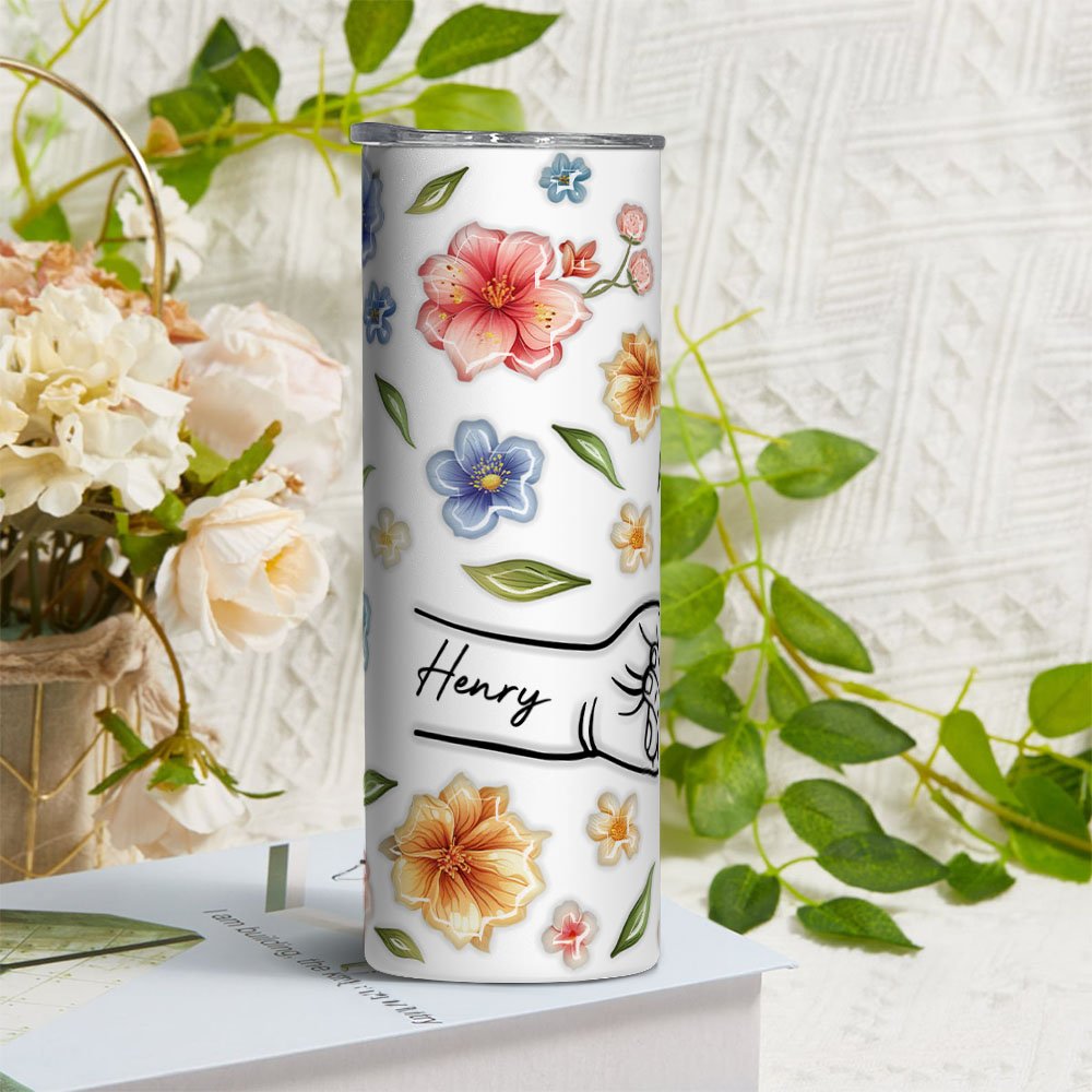 Dieser dünne Becher mit seinem einzigartigen Muster der haltenden Hände symbolisiert, dass wir unter der Obhut unserer Mütter oder Großmütter aufwachsen. Er kann mit dem Namen Ihrer Mutter oder Großmutter und den Namen von 1-9 Kindern personalisiert werden. Das Design verwendet 3D-Bildeffekte, um die schönen Blumen zum Leben zu erwecken und die Muster lebendiger zu machen.