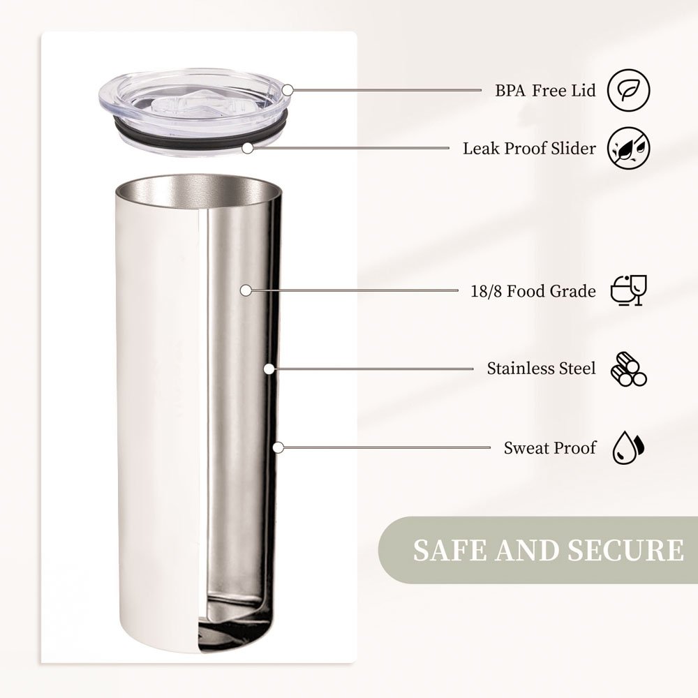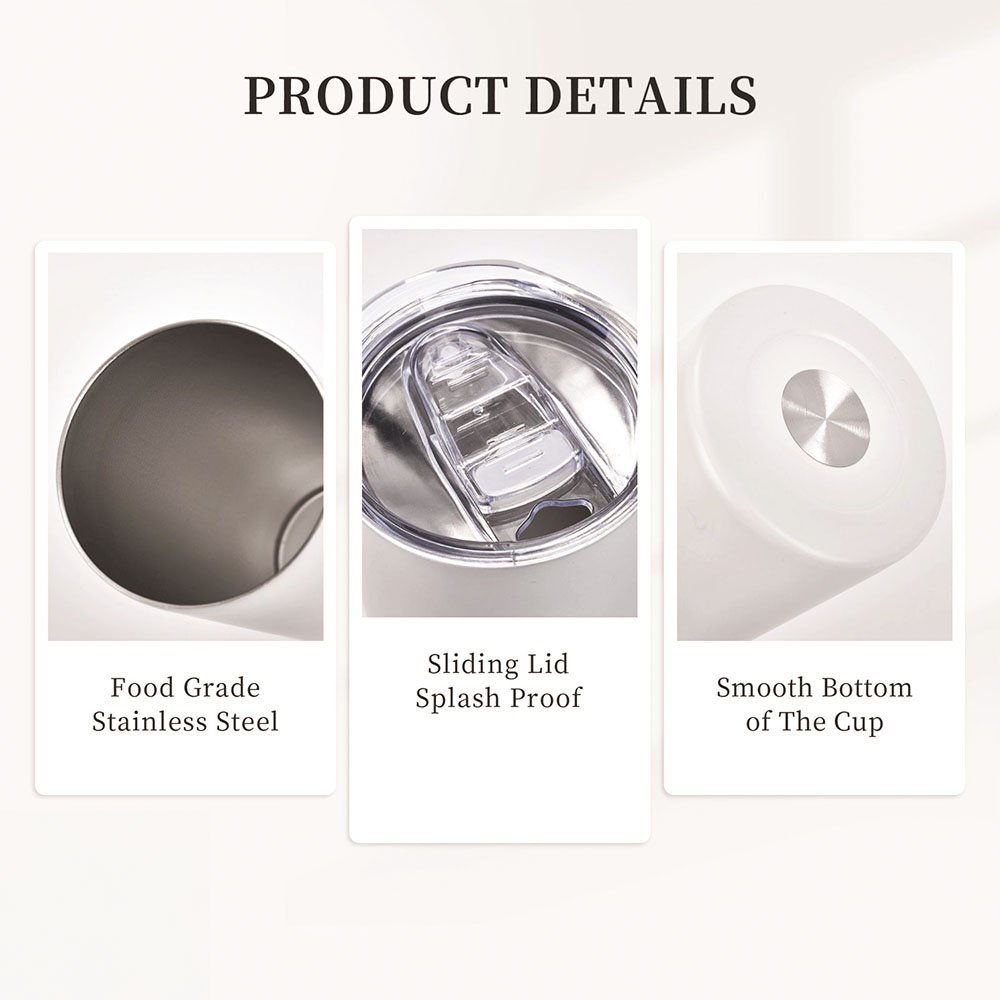Das Gehäuse des Bechers besteht aus lebensmittelechtem Edelstahl mit einem BPA-freien Deckel, der sicher zu trinken ist. Egal, ob Sie unterwegs sind oder einfach nur zu Hause entspannen, das innovative Design des auslaufsicheren Schiebers des Deckels verhindert ungewolltes Verschütten. Der schlanke Becher ist schweißfest, damit Ihre Hände trocken bleiben und Sie ihn bequem greifen können. Dieser Becher hält den Anforderungen des täglichen Gebrauchs stand, und sein perfektes Design garantiert Langlebigkeit und Haltbarkeit.