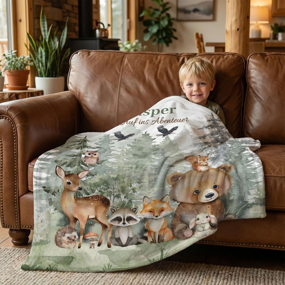 Diese Decke überzeugt durch ein liebevoll gestaltetes Aquarell-Design mit Dschungeltieren und zeigt lebendig eine Vielzahl niedlicher Tiere wie einen Bären, ein Reh, einen Fuchs, einen Waschbären und eine Eule. Die frischen und sanften Farben entführen Kinder in einen märchenhaften Wald und wecken Fantasie sowie kindliche Neugier. Durch die Personalisierung mit einem Namen und individuellem Text erhält die Decke eine ganz besondere Bedeutung und wird zu einem einzigartigen Einzelstück.