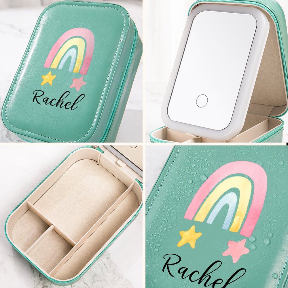 Diese Schmuckschatulle verbindet meisterhaft ein Aquarell-Regenbogendesign mit moderner Raffinesse und bietet eine einzigartige und elegante Ästhetik. Wählen Sie aus sechs Regenbogenmustern und vier PU-Lederfarben, um einen maßgeschneiderten Look zu kreieren, und fügen Sie eine persönliche Note hinzu, indem Sie Ihren Namen aufdrucken lassen - so wird die Schatulle zu einem einzigartigen Schatz, der auffällt.