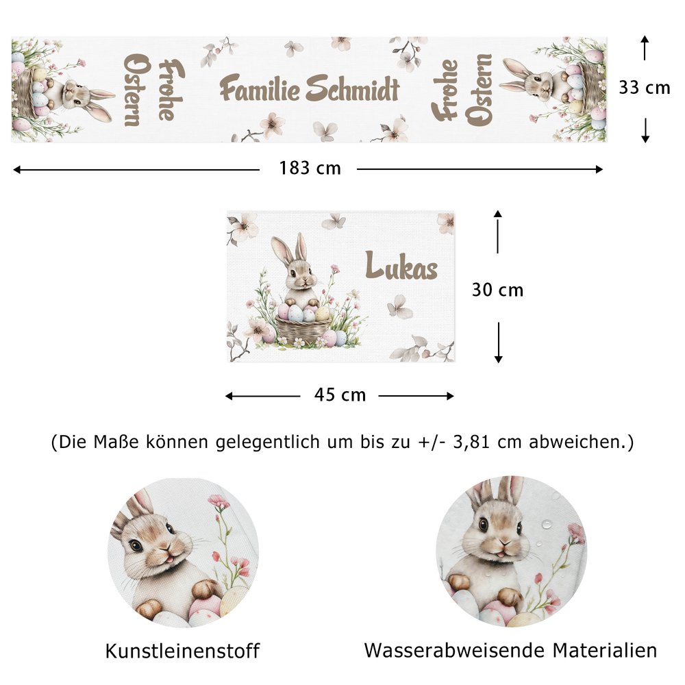 Der Osterhase, liebevoll in zarter Aquarelltechnik gestaltet und ergänzt durch Eier sowie florale Muster, verleiht Ihrem Ambiente eine sanfte und einladende Ausstrahlung. Personalisieren Sie das Motiv mit Ihrem Familien- oder Vornamen, um ein einzigartiges und unverwechselbares Design zu kreieren. Passend dazu sorgen der Tischläufer und die Tischsets für ein harmonisches Gesamtbild und schaffen eine festliche Atmosphäre, die sofort ins Auge fällt.