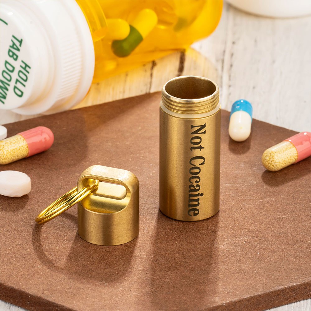 Dieses Tablettenetui ist aus langlebigem Messing gefertigt und somit wasserdicht und robust. Es sorgt dafür, dass Ihre Medikamente sicher und trocken aufbewahrt werden, egal ob Sie zu Hause, auf Reisen oder bei der Arbeit sind. Die robuste Konstruktion garantiert eine lange Nutzungsdauer und macht es zu einem zuverlässigen Accessoire für das tägliche Leben.