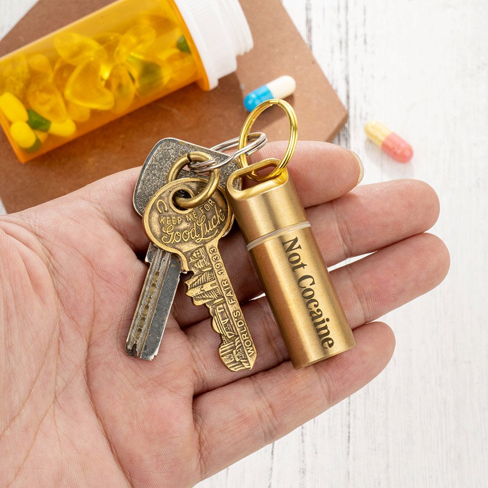 Auf der Vorderseite des Tablettenetuis ist der Schriftzug "Not Cocaine" eingraviert, der eine humorvolle Note verleiht und gleichzeitig den Inhalt kennzeichnet. Dieses witzige und praktische Design hilft, Missverständnisse zu vermeiden, und ist somit ideal für alle, die täglich Medikamente bei sich tragen müssen.