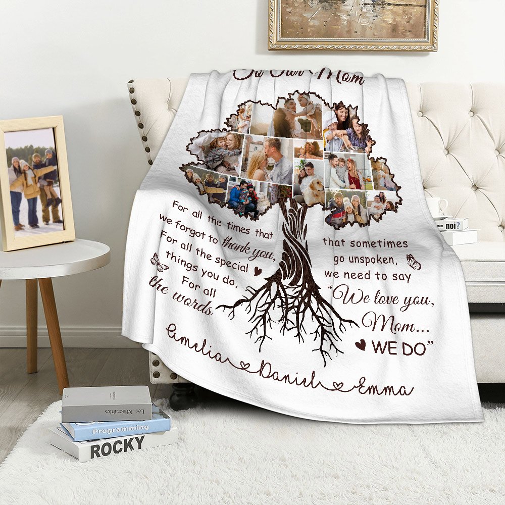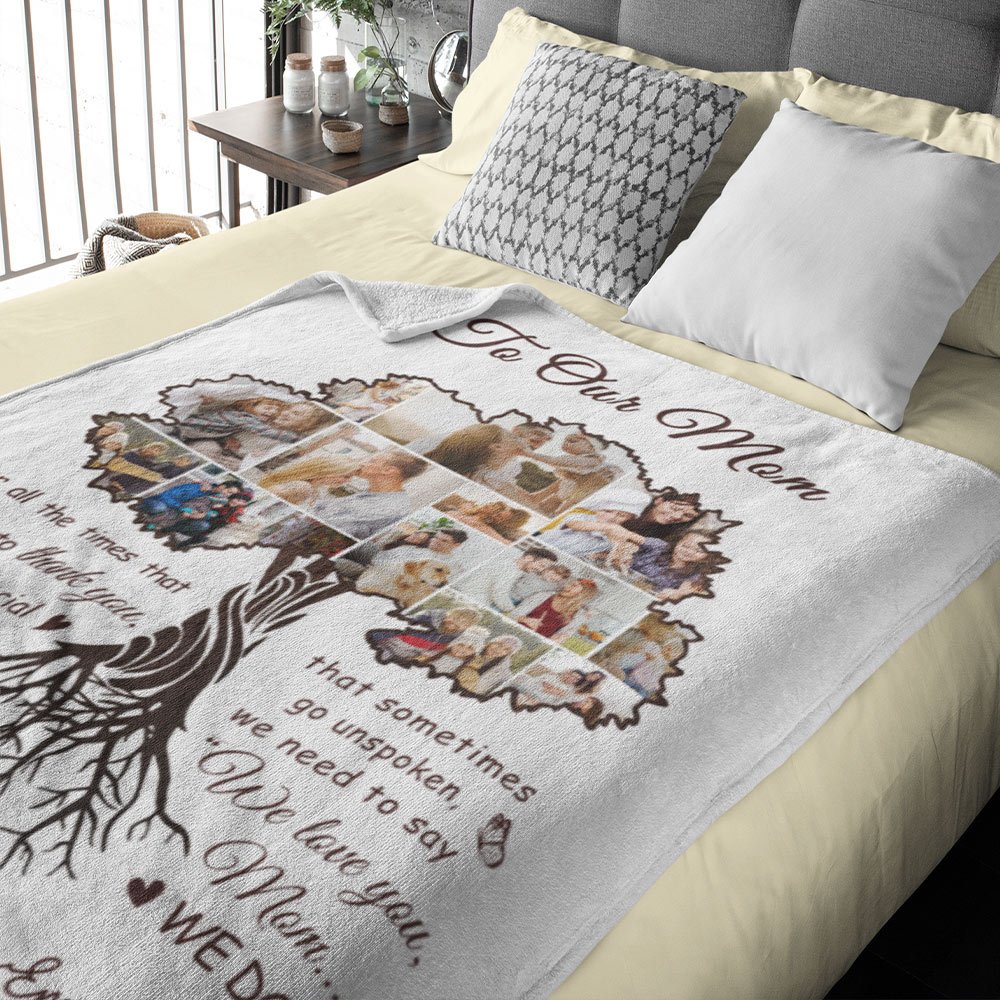 Das Design dieser Decke basiert auf dem Konzept, eine Fotocollage mit einem Baum zu kombinieren. Sie kann mit den Namen von bis zu 10 Kindern gestaltet werden, die jeweils durch ein Herz verbunden sind. Herzerwärmende Fotos fügen sich zu einem Stammbaum zusammen und ergeben ein emotionales Familienbild. Jeder Name und jedes lächelnde Gesicht ist die berührendste Quelle der Verbundenheit und des Glücks dieser Familie.