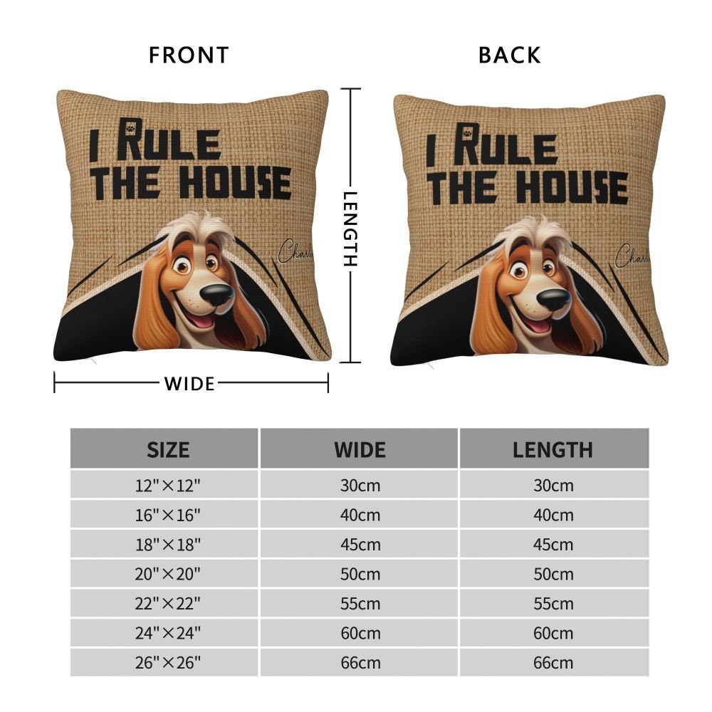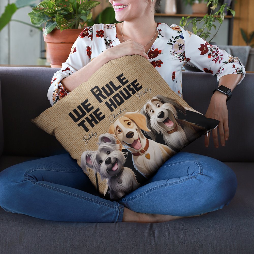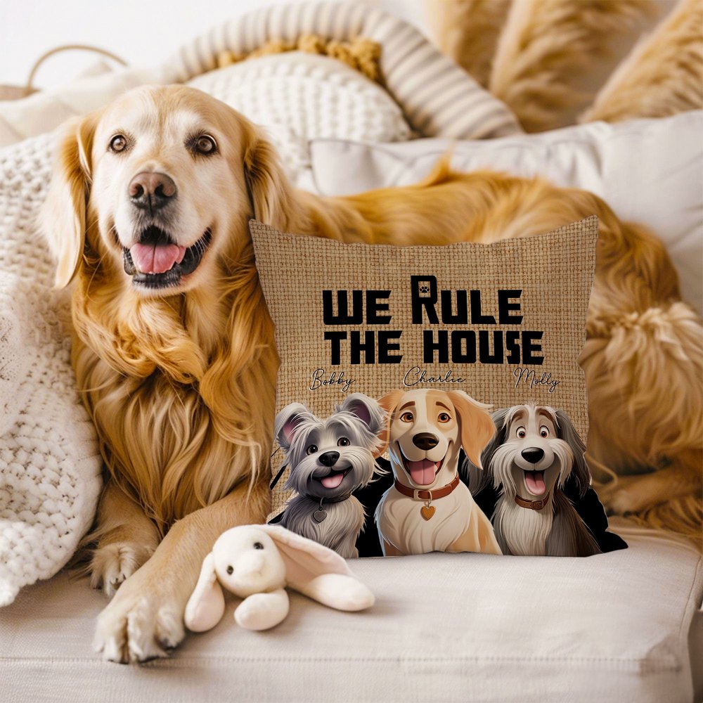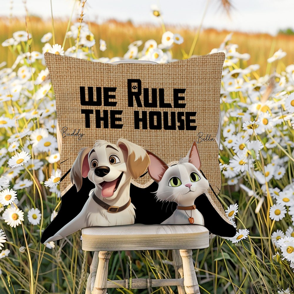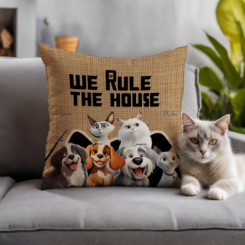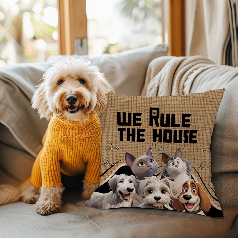 Unser Kissenbezug zeigt ein charmantes Cartoon-Tierdesign, das liebenswerte Katzen und Hunde in einem verspielten und künstlerischen Stil darstellt. Der auffällige Slogan "We Rule The House", verziert mit einem niedlichen Pfotenmuster, zeigt die lustige und schelmische Seite unserer geliebten Haustiere. Es kann auch mit den Namen Ihrer Haustiere (bis zu 6 Namen) personalisiert werden, was Ihrem Zuhause eine einzigartige und herzliche Atmosphäre verleiht.