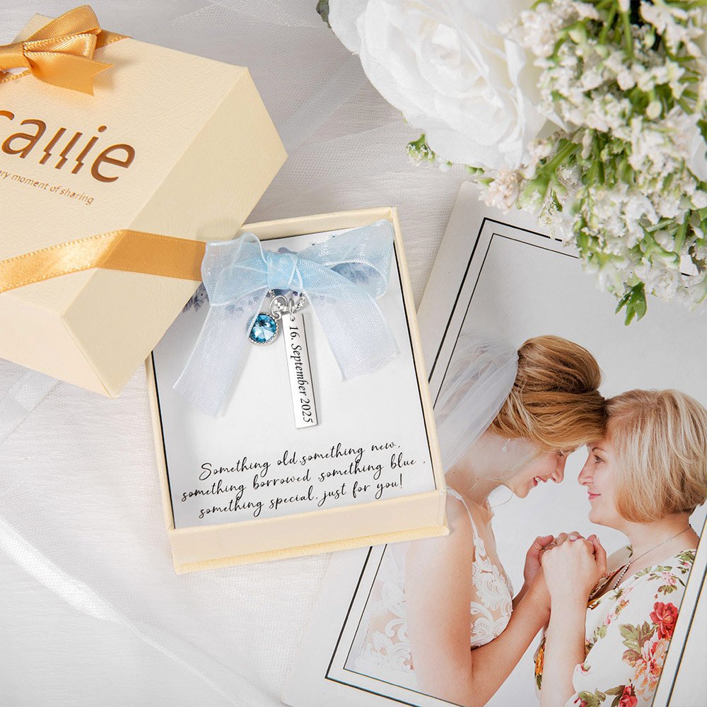 Der runde blaue Kristallanhänger sowie der silberne oder goldene Charm mit blauer Spitze können individuell mit dem Namen der Braut, ihren Initialen oder dem Hochzeitsdatum graviert werden. Durch diese persönliche Gravur wird das Accessoire zu einem liebevollen Erinnerungsstück, das die Braut noch viele Jahre in Ehren halten wird.