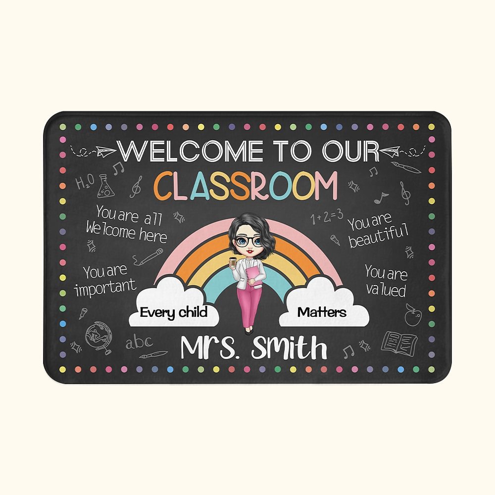 Diese Fußmatte zeigt ein herzerwärmendes "Willkommen in unserem Klassenzimmer"-Zitat, begleitet von einer lebendigen Regenbogenbrücke, die eine Atmosphäre der Wärme und Gastfreundschaft für jeden schafft, der das Klassenzimmer betritt. Eine fröhliche Art, Schüler, Eltern und Besucher gleichermaßen zu begrüßen. (PERSÖNLICHE NOTE): Die Fußmatte kann mit dem Cartoon-Bild und dem Namen des Lehrers individuell gestaltet werden. So wird sie zu einem auffälligen Stück, das die Persönlichkeit des Lehrers widerspiegelt und der Klassenzimmereinrichtung eine besondere Note verleiht.