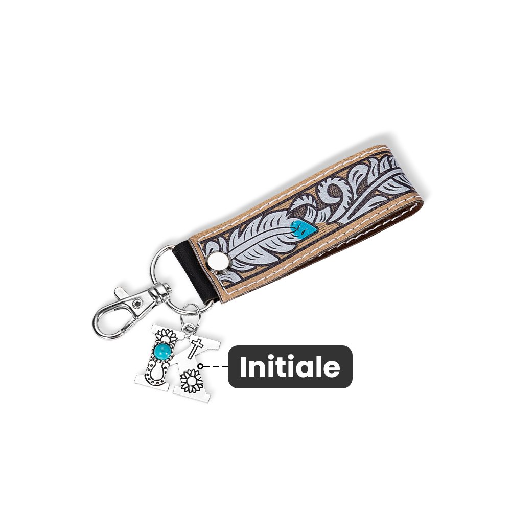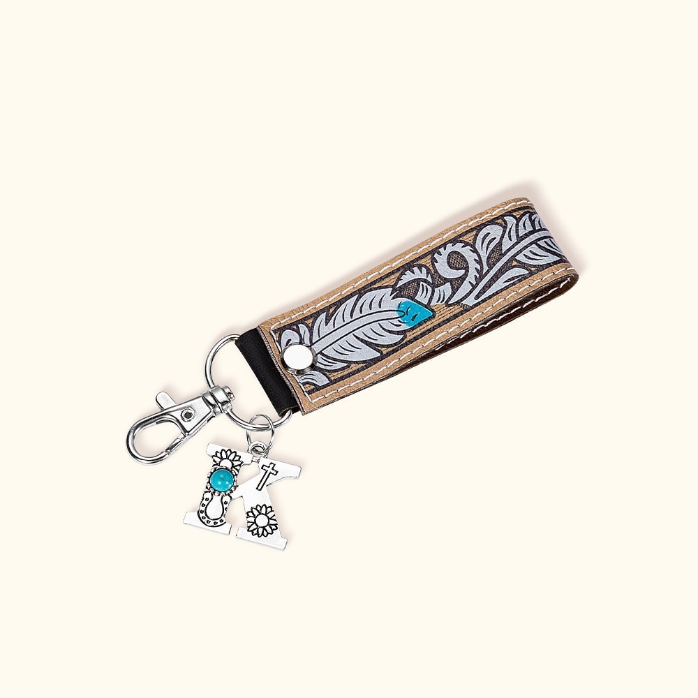 Dieser Schlüsselanhänger ist in einem sehr westlichen Cowboy-Stil entworfen, mit fünf Mustern zur Auswahl, einzigartiger und origineller Schönheit. Der Schlüsselanhänger kommt auch mit einem optionalen Initial-Anhänger, der mit türkisfarbenen Steinen für einen anspruchsvollen Look geschmückt ist.