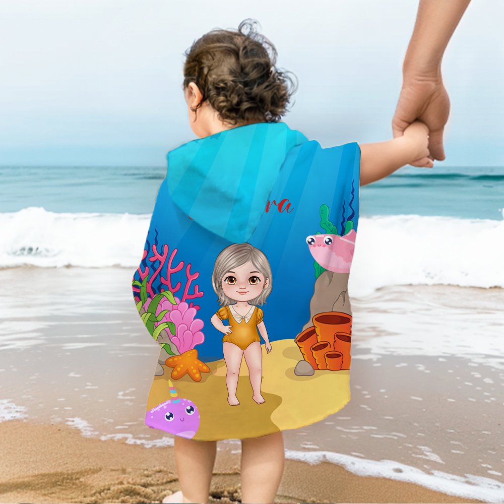 Dieser Badeponcho zeigt bezaubernde Meerestiere, darunter Wale, Delfine, Meeresschildkröten, Quallen und mehr. Mit einer magischen Unterwasser-Kulisse lädt es Kinder dazu ein, die Wunder des Meeres zu erforschen und dabei diese bezaubernden Meeresbewohner zu treffen. Sie können es auch mit dem Namen Ihres Kindes personalisieren, was es zu einem einzigartigen Strandutensil macht.