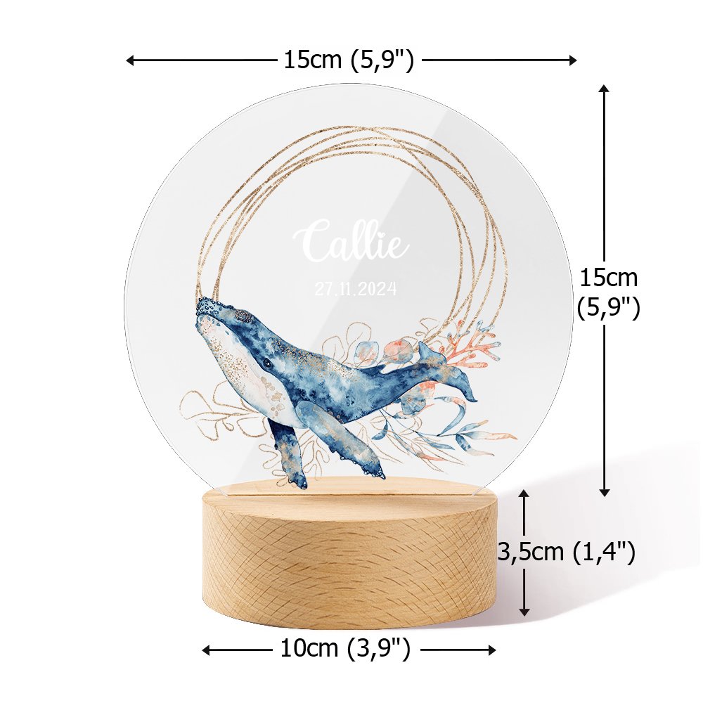 Unser Nachtlicht hat Meerestiere zum Thema und zeigt 7 verschiedene Arten von Wassertieren, darunter Wal, Oktopus, Seepferdchen, Muschel, Qualle, Seestern und Meeresmuschel. In das Nachtlicht sind auch einige Wellenmuster aus goldenen Linien integriert, die sich sanft wellenförmig bewegen und perfekt mit dem Schwimmen der Meerestiere harmonieren, wodurch eine verträumte und schöne Atmosphäre entsteht. Der Name kann auch auf dem Nachtlicht angepasst werden, um es noch spezieller zu machen.