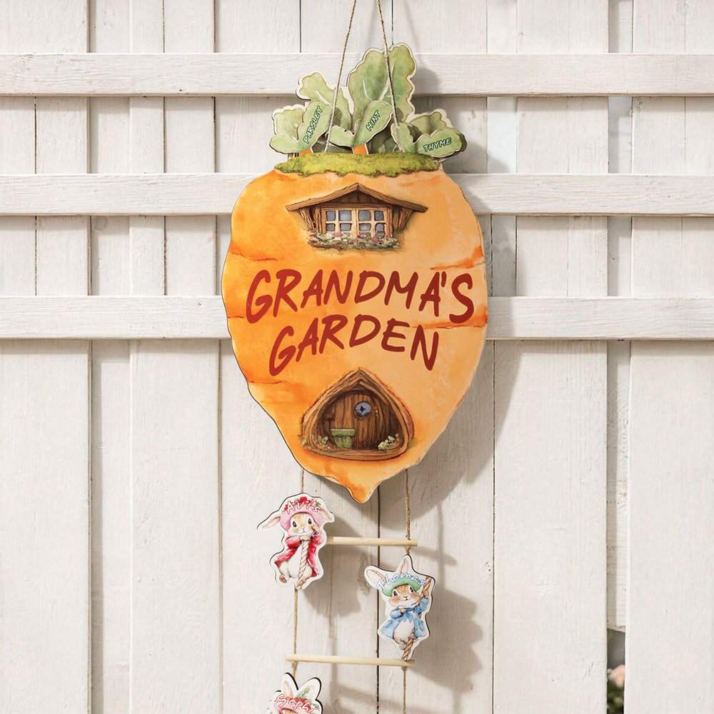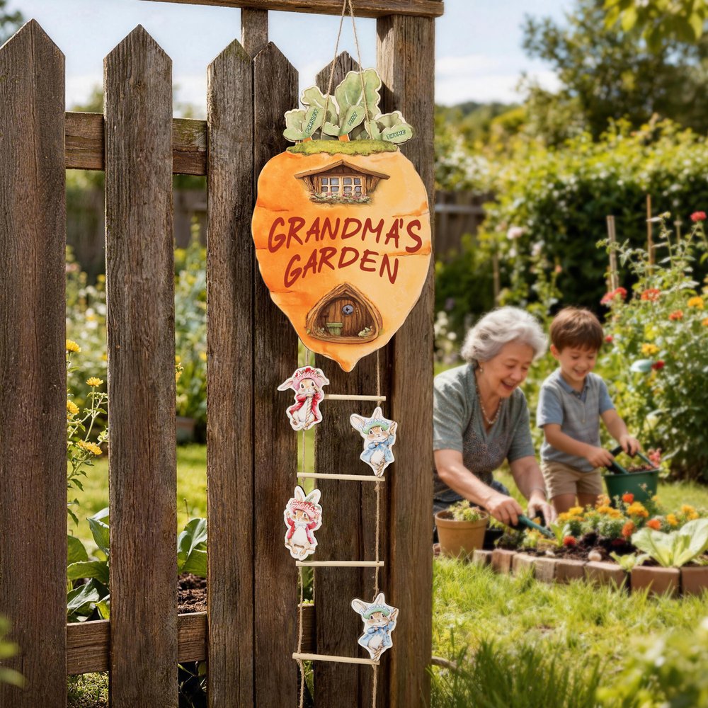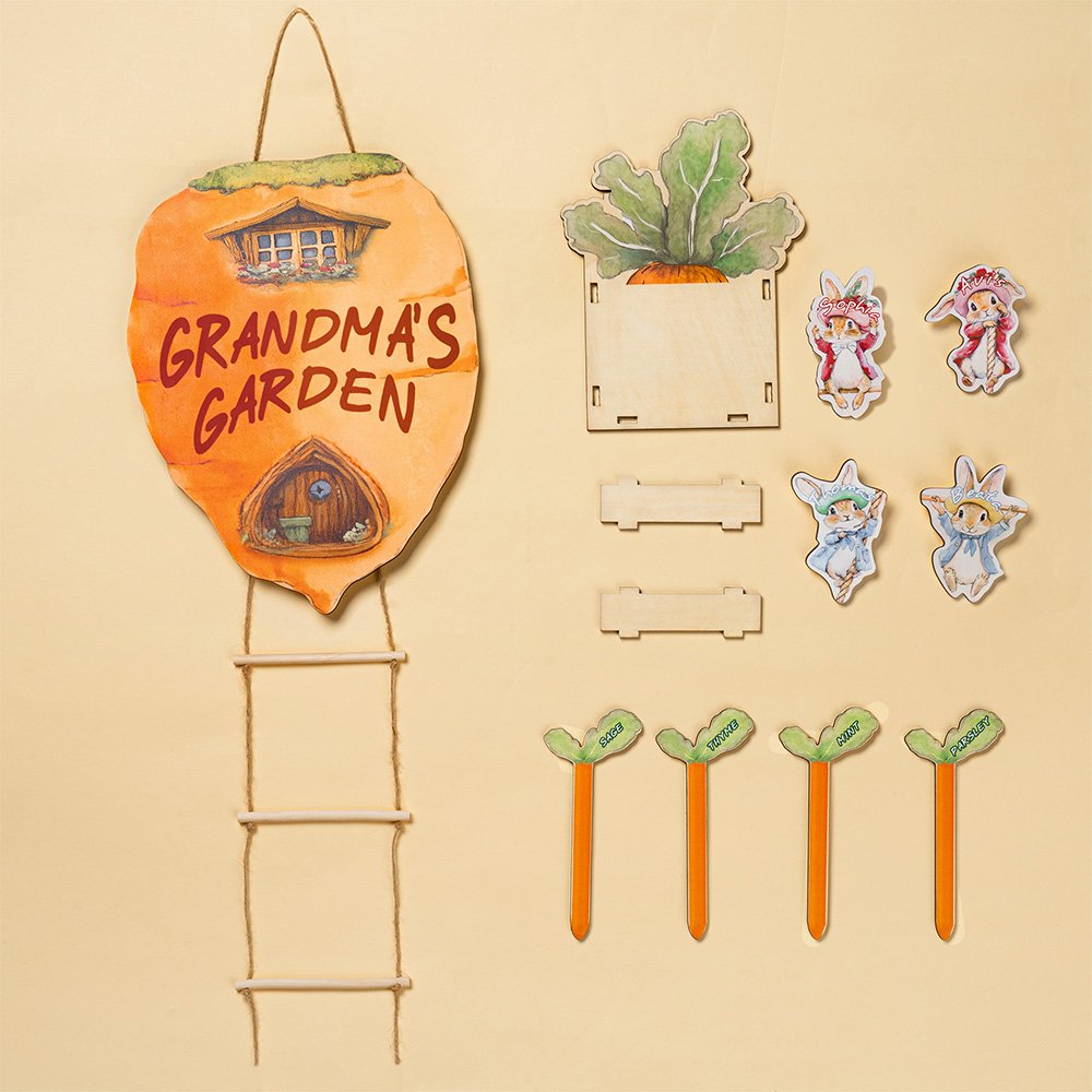 Diese personalisierte Peter Rabbit-Möhren-Holzdekoration für den Garten ist von der klassischen Peter Rabbit-Figur inspiriert. Das Design integriert geschickt das Karottenhaus und die Strickleiter und kombiniert die Kaninchen perfekt mit Pflanzenanhängern, um eine lebendige und fröhliche Familienatmosphäre zu schaffen. Sie ist nicht nur optisch ansprechend, sondern weckt auch die Liebe der Kinder zur Natur, ermutigt sie zur Gartenarbeit und stärkt das Miteinander in der Familie.