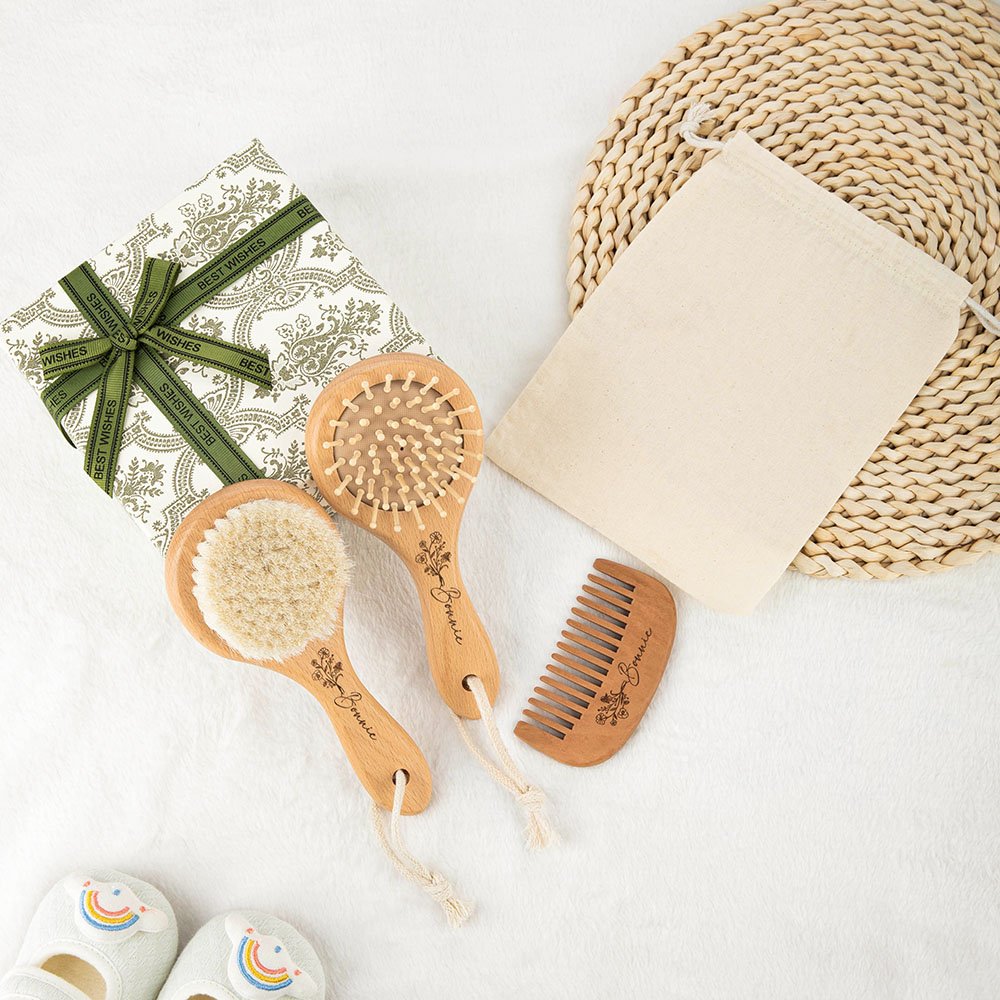 Sie können jede Bürste und jeden Kamm mit dem Namen und der Geburtsblume Ihres Babys individuell gestalten; diese einzigartige Eigenschaft macht sie zu einem aufmerksamen und unvergesslichen Geschenk, das die Ankunft eines neuen Wonneproppens feiert.