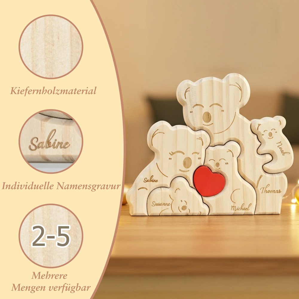 Das Design dieses Puzzles basiert auf dem Thema der Koalas. Sie können eine Kombination aus 2 bis 5 Koalas wählen, je nach Anzahl der Familienmitglieder. Die Namen der Familienmitglieder können für jeden Koala angepasst werden. Die Koalas kuscheln sich aneinander und symbolisieren so die Vertrautheit und Wärme der Familie. Die rote Liebe in der Mitte steht für die Liebe zwischen den Familienmitgliedern.