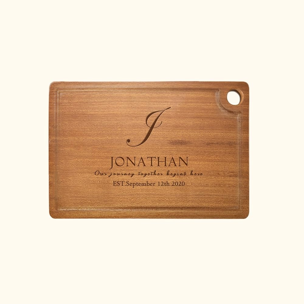 Die personalisierten Schneidebretter verfügen über unsere exklusiven Designs mit Initialen und Nachnamen, die von Ihnen angepasst werden können. Wählen Sie aus Sprüchen wie "Das Herz eines glücklichen Zuhauses ist die Familie", "Unsere gemeinsame Reise beginnt hier", "Wo unsere Geschichte beginnt", oder geben Sie Ihren eigenen Text ein.