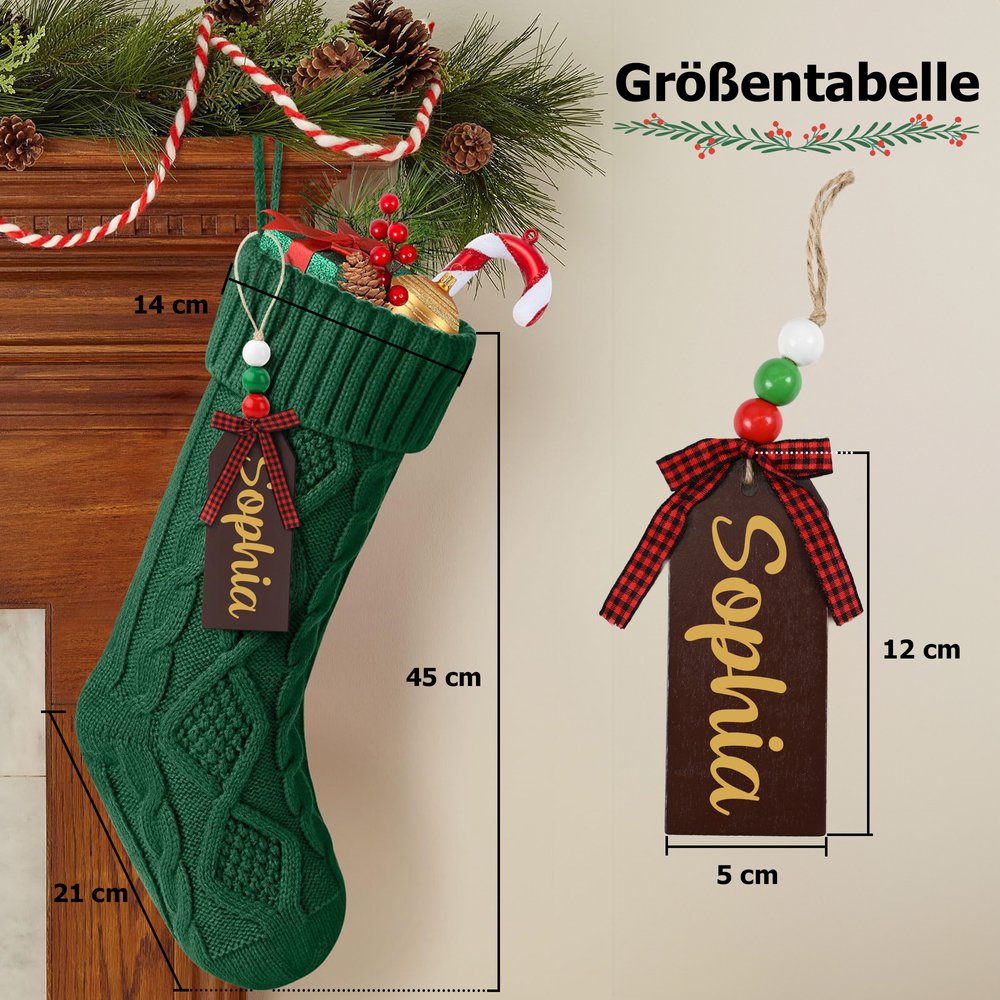 Diese Weihnachtsstrümpfe sind in Rot, Weiß und Dunkelgrün erhältlich und verfügen über personalisierbare Holzanhänger mit Perlen und karierter Schleife. Sie können einen Namen hinzufügen, um ein einzigartiges Stück zu gestalten – perfekt, um Ihrer Weihnachtsdekoration eine persönliche Note zu verleihen und an Heiligabend eine fröhliche Schneestimmung zu schaffen.