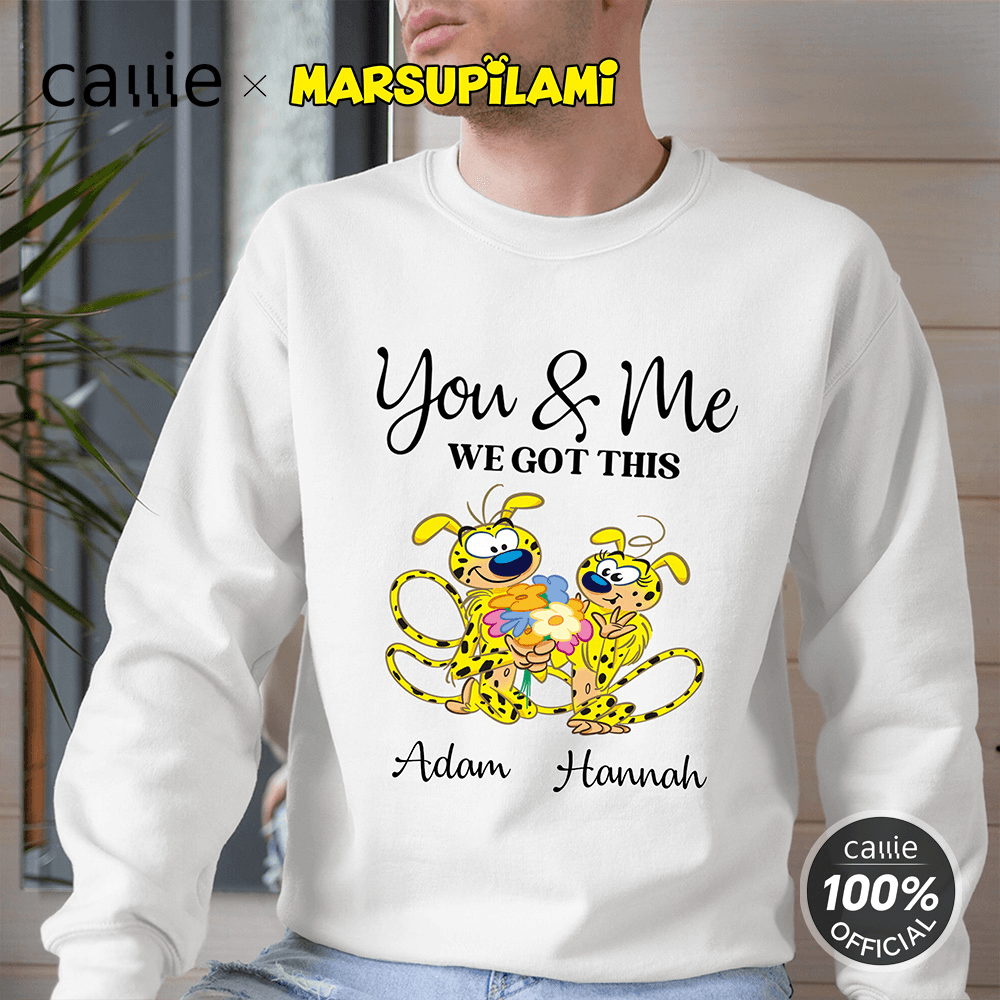Sie können das niedliche Cartoon-Muster des schwanzhüpfenden Matthäus wählen, das 1952 vom belgischen Cartoonisten André Franquin geschaffen wurde. Das Marsupilami ist ein Dschungelwesen mit gelbem Fell, schwarzen Flecken und einem superflexiblen, langen Schwanz. Dieses Kleidungsstück kann mit süßen Segenssprüchen wie "You & me WE GOT THIS" versehen werden, und du kannst es auch mit einem Namen versehen, was es zu einem personalisierten Alltagsgegenstand macht.