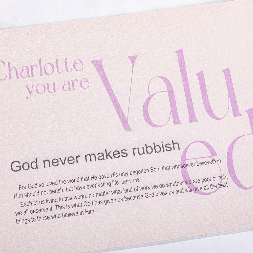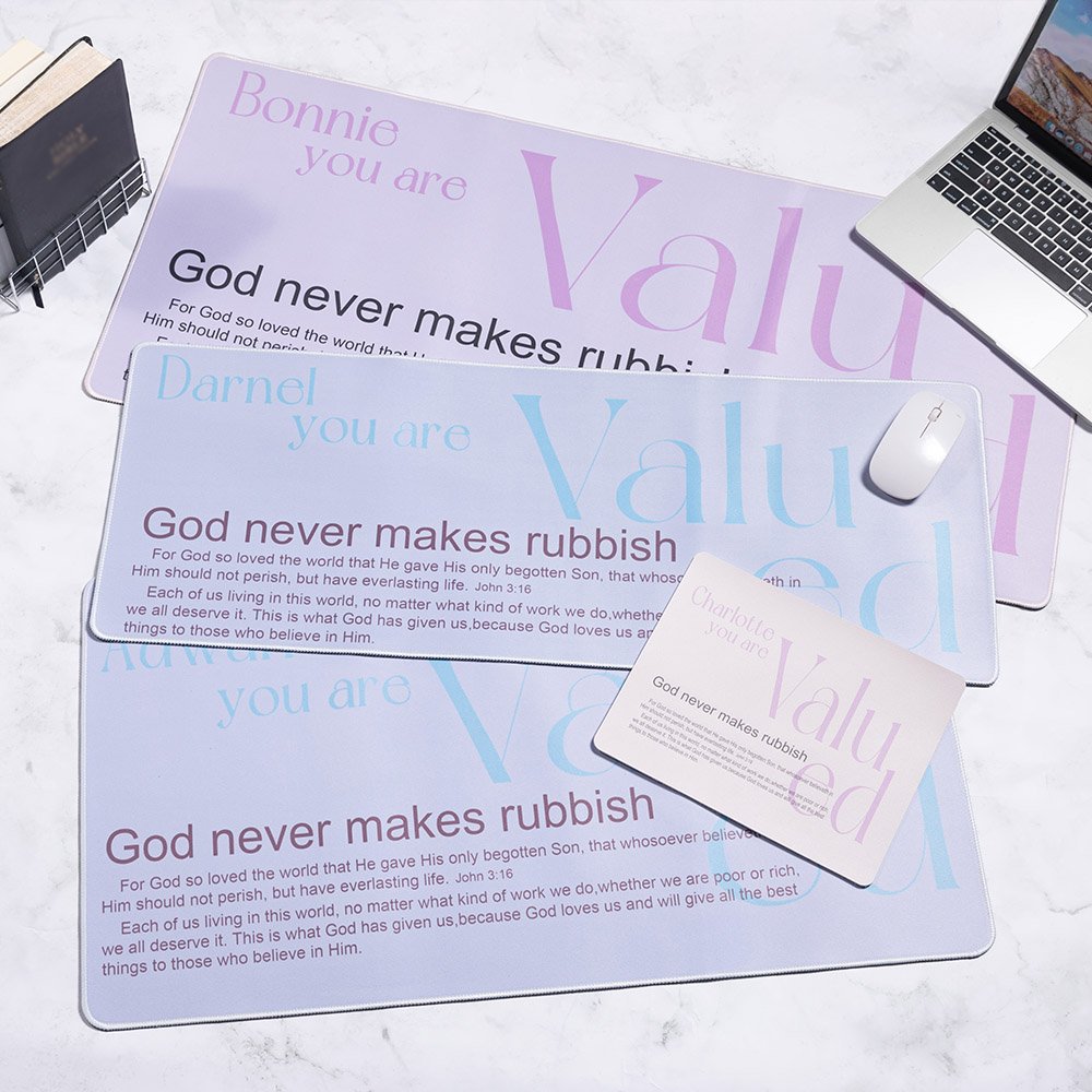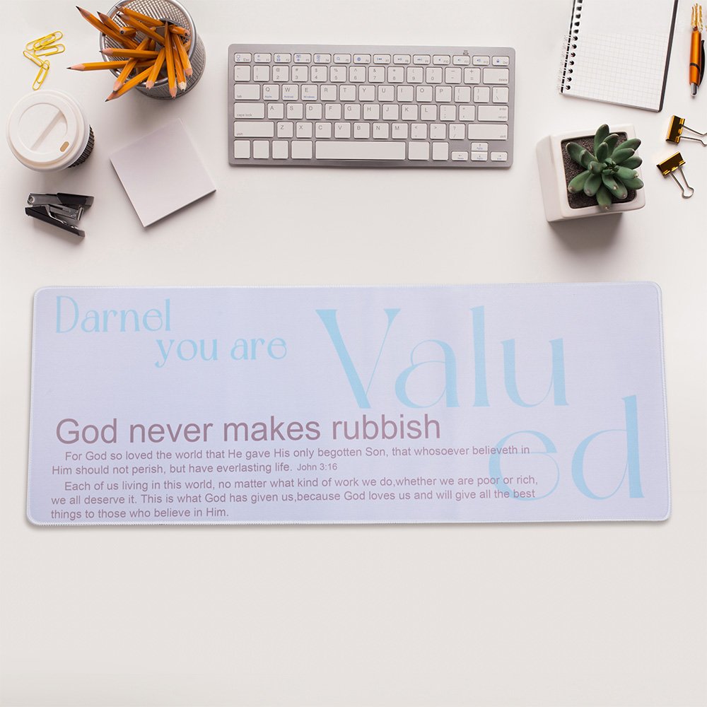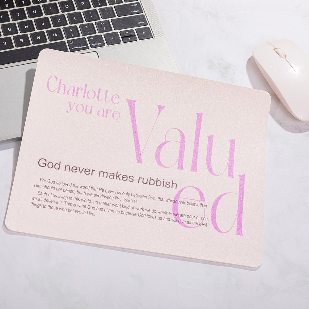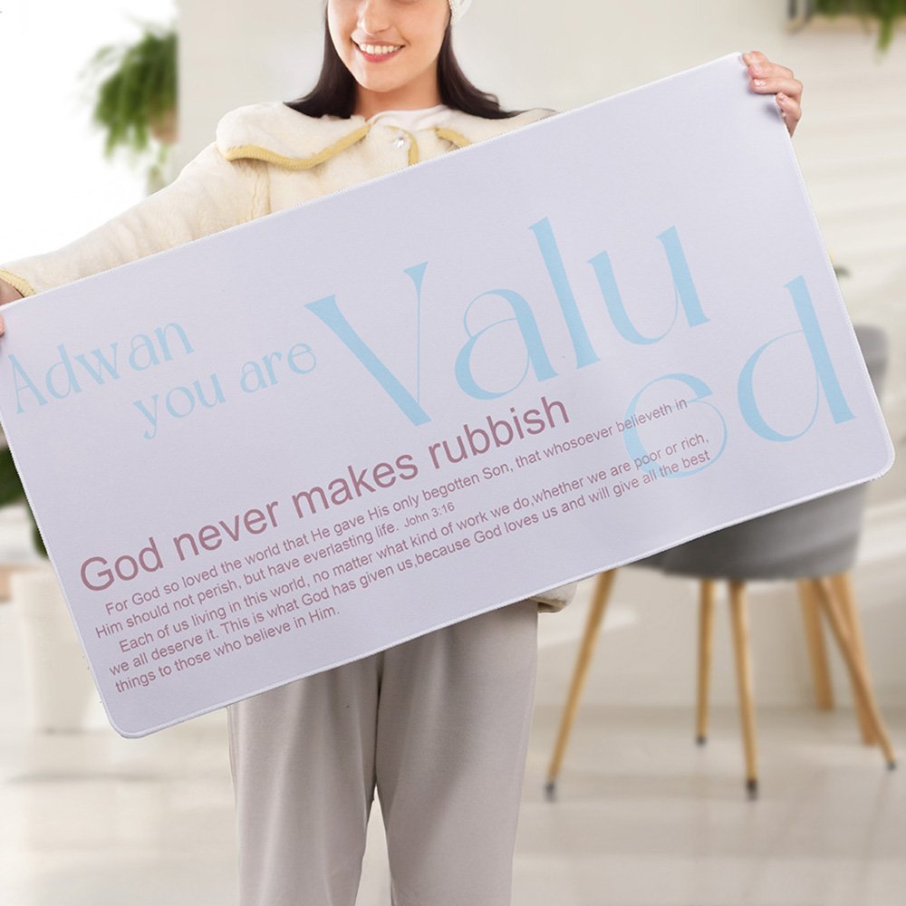 Mit den Sprüchen "You Are Valued" und "God Never Makes Rubbish" kann es mit einem Namen versehen werden, was es zu einem einzigartigen Geschenk macht. Erhältlich in zwei eleganten Farboptionen und vier Größen, dient es sowohl als Mausunterlage als auch als Schreibtischunterlage. Ob für die Arbeit, das Studium oder die persönliche Reflexion, dieses vielseitige Stück wertet jeden Arbeitsplatz auf.