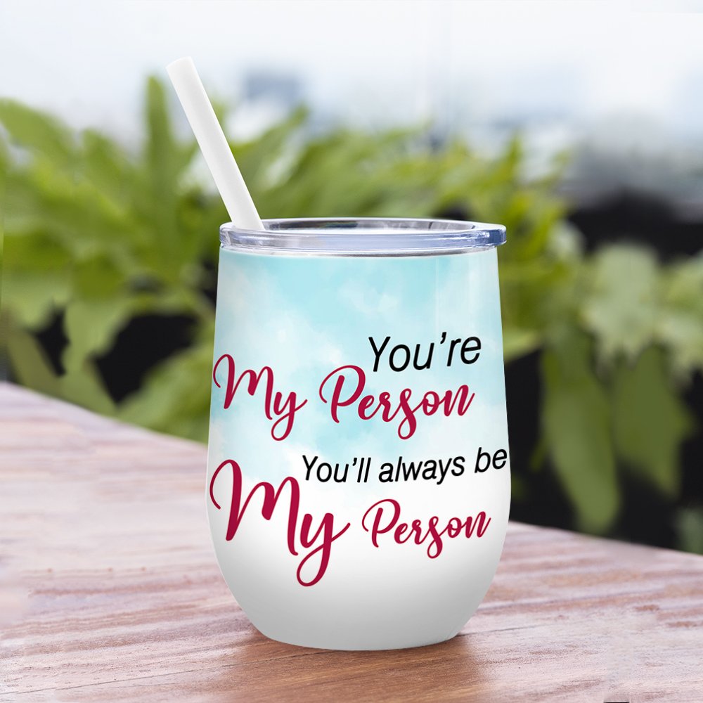 Das "You're My Person"-Zitat feiert die unzerbrechliche Bindung, die du mit deinem besten Freund teilst. Und das Besondere an diesem Weinbecher ist die Personalisierung. Du kannst Namen und Design hinzufügen, die eure Freundschaft perfekt widerspiegeln.