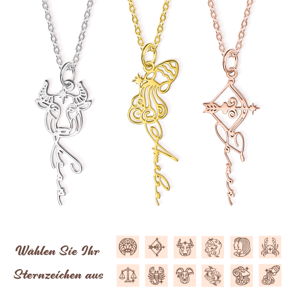 Der Anhänger dieser Halskette verfügt über ein ausgehöhltes Design, das eine Kombination aus Sternzeichenmustern und Namen ist, exquisit und elegant, können Sie ein einzigartiges Schmuckstück anpassen, indem Sie seinen exklusiven Stil nach dem Sternzeichen des Trägers wählen und ihren Namen hinzufügen.