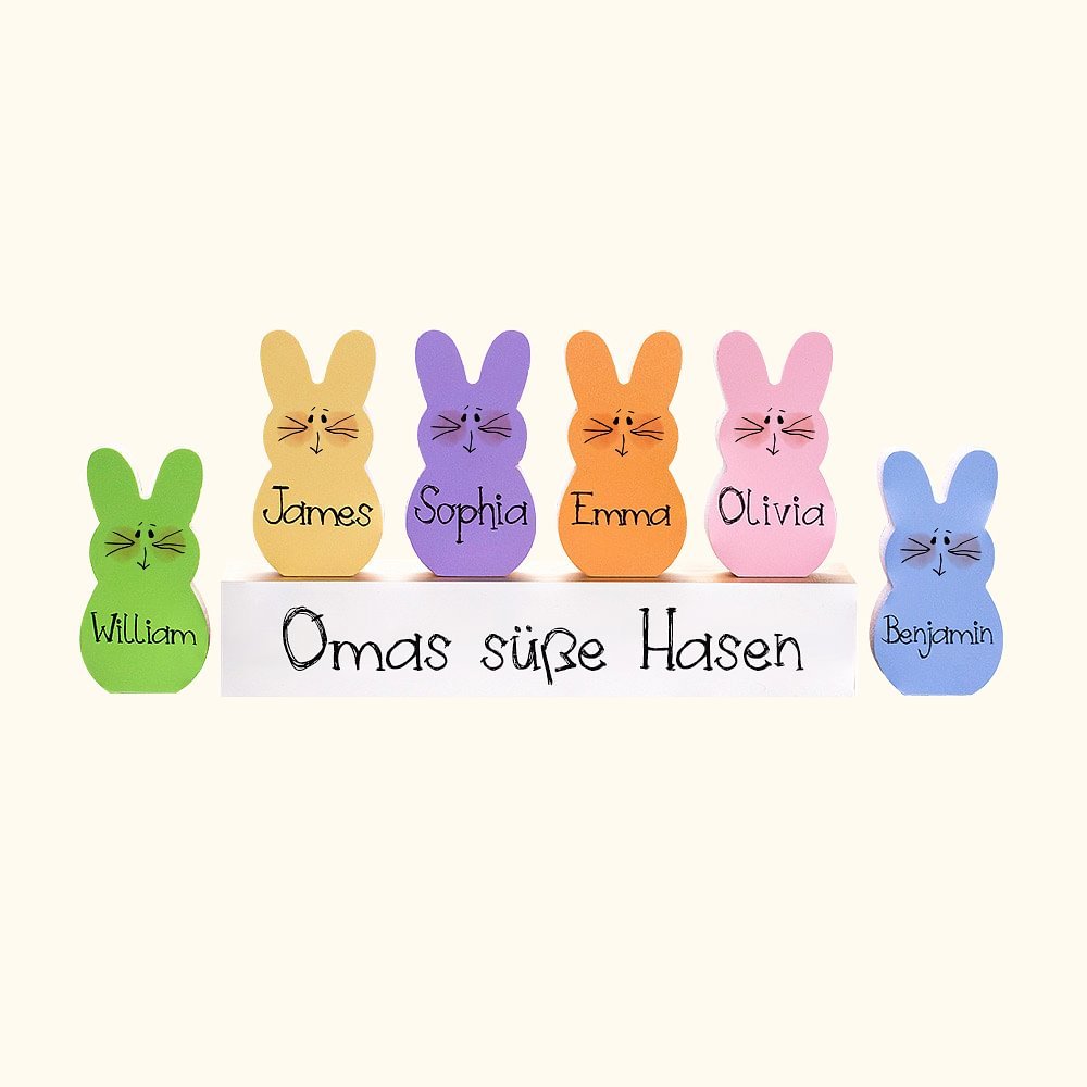 Sie suchen nach dem perfekten Ostergeschenk? Dieses bezaubernde Hasenblock-Set ist die ideale Wahl für Oma, Opa, Mama oder Papa. Es ist eine aufmerksame Art und Weise, die Namen der Familie zu präsentieren und jeder Feier eine persönliche Note zu verleihen. Ob als festliche Dekoration oder als sinnvolles Geschenk, dieses Set macht jedes Osterfest zu etwas ganz Besonderem.